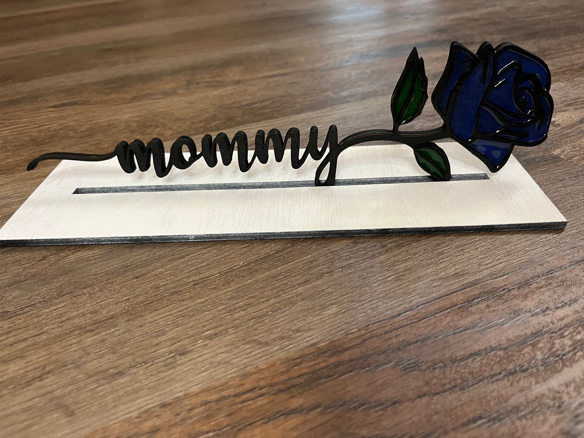 This lasercut rose comes in various colors and phrase options and a base to lay it on. The rose and leaves are filled with epoxy to give it a glassy finish. Perfect gift for Valentine's Day, Mother's Day, or birthday gift.