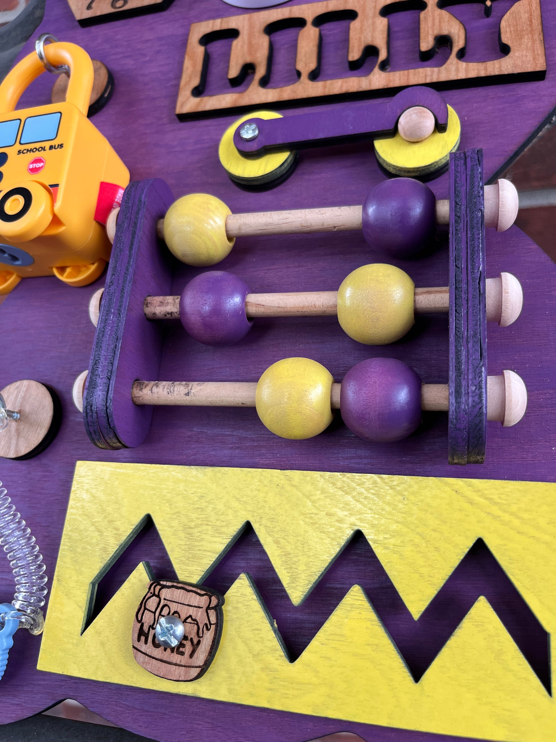 This bear-shaped busy board is made of painted 1/4" birch plywood. The board is 16 inches tall and 11 inches wide with a spinner, multicolored LED push light, engraved clock with spinning hands, personalized name pegs, plastic lock and key, 6 sliding beads, and a sliding zig zag honey pot.