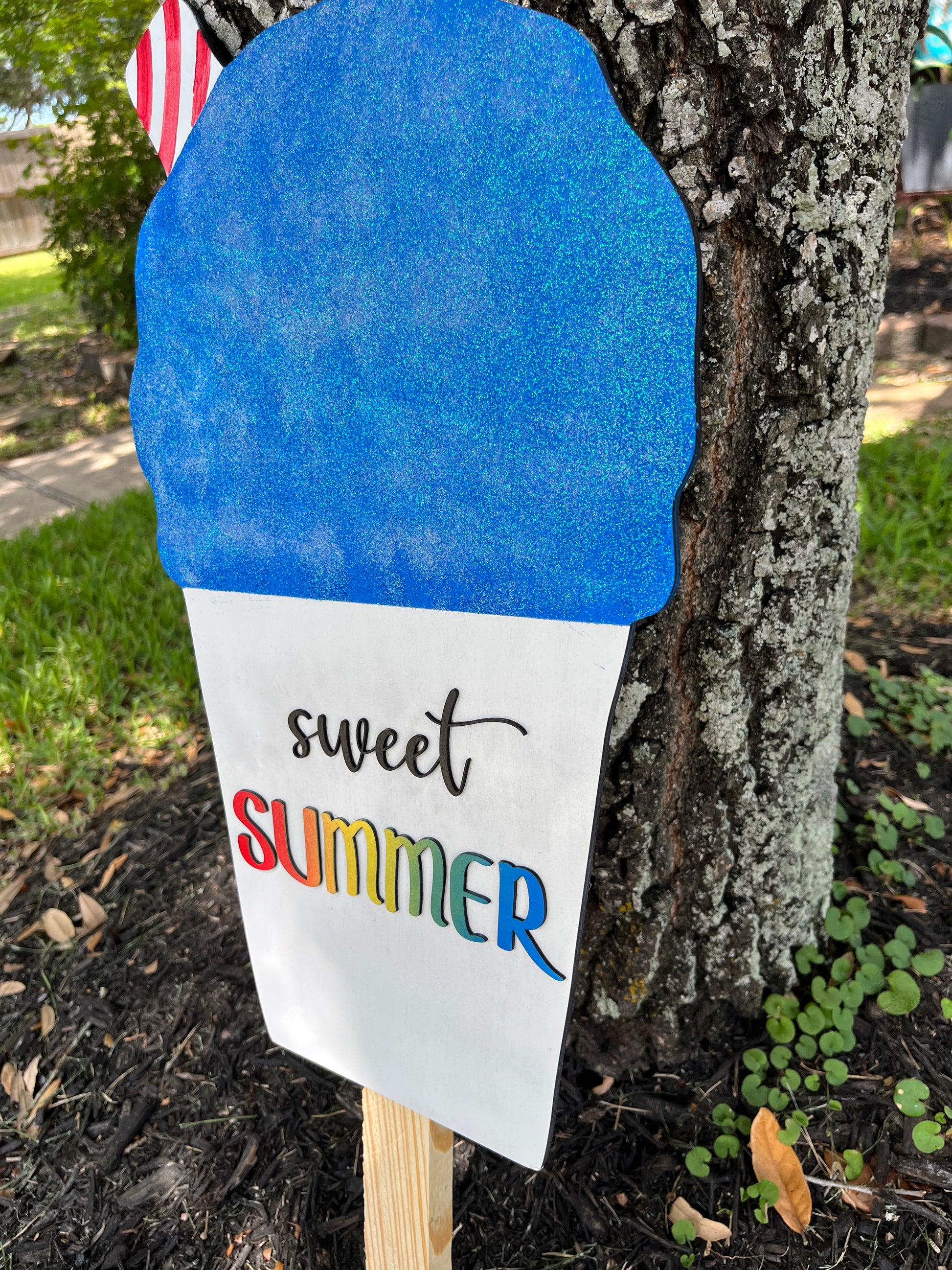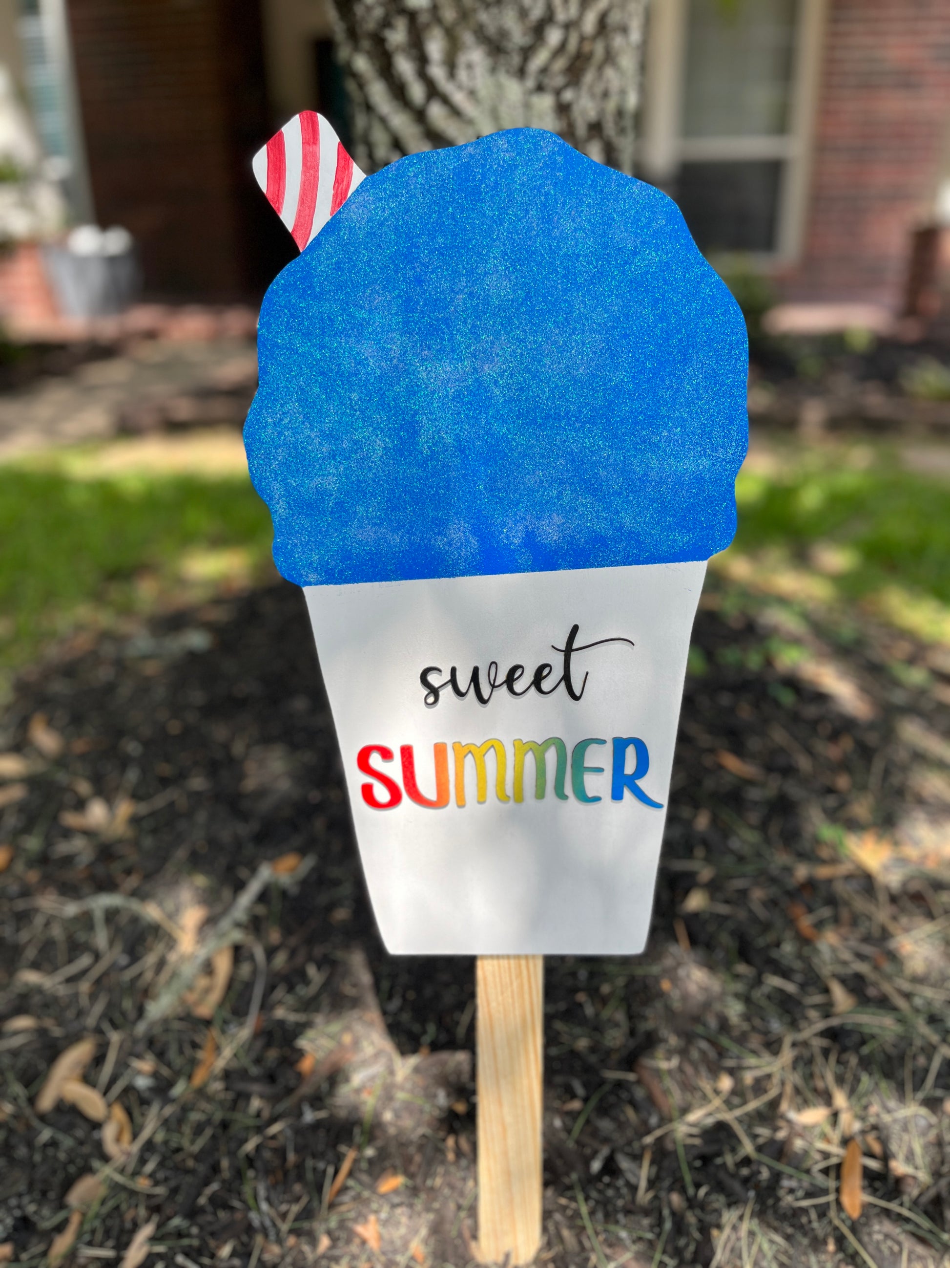 This 18" snow cone (ie snowball if you're from New Orleans) is made if 1/4" birch plywood and comes in many different colors. It has a glittery shine on the "snow" part but is sealed with a clear top coat so you don't have a glittery mess.