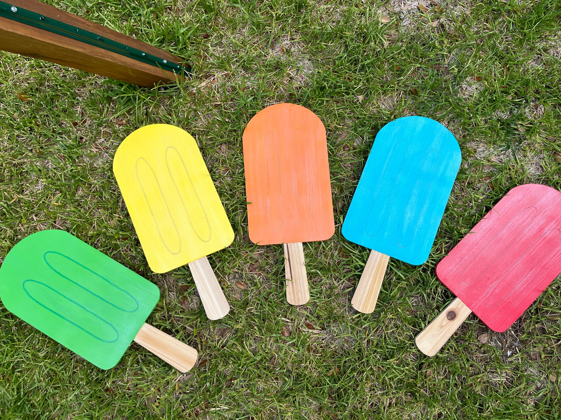 Glittery popsicles are available as 15" tall or 23" (plus yard stake attached to back). Choose any colors you like and if you want it personalized.