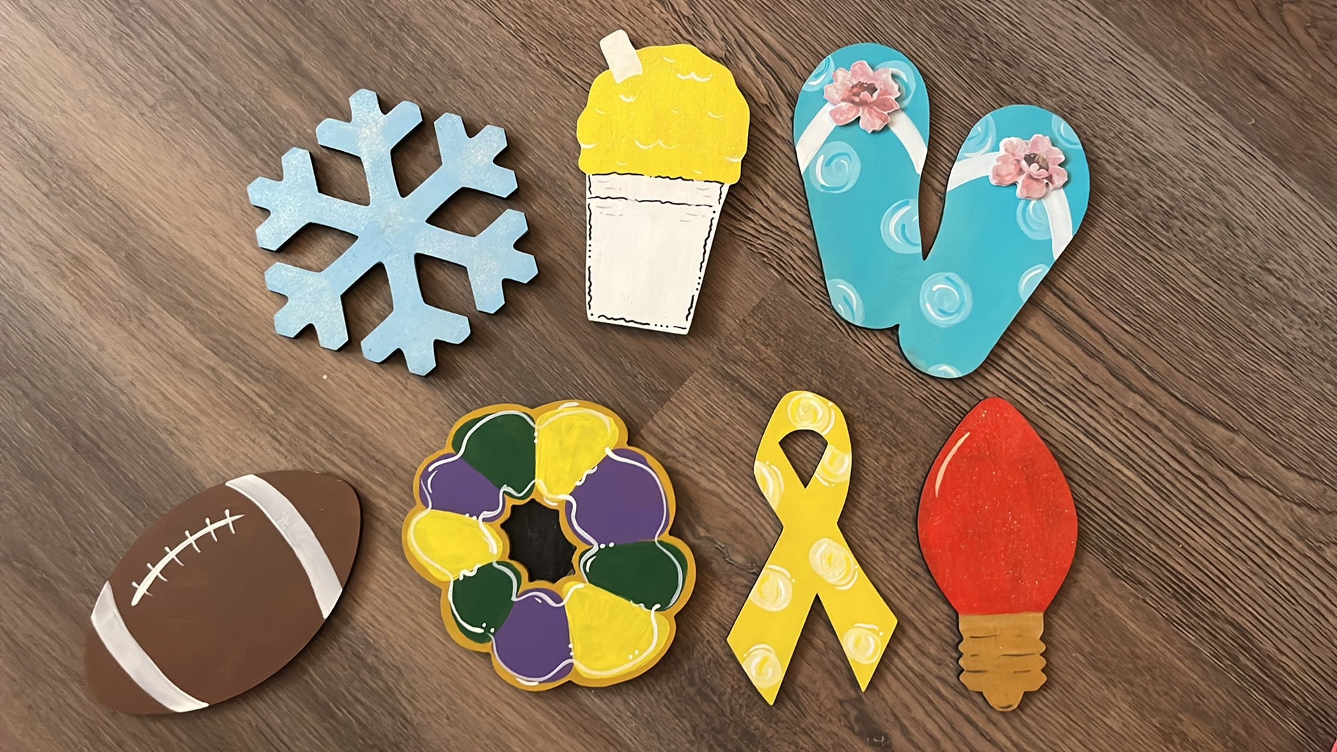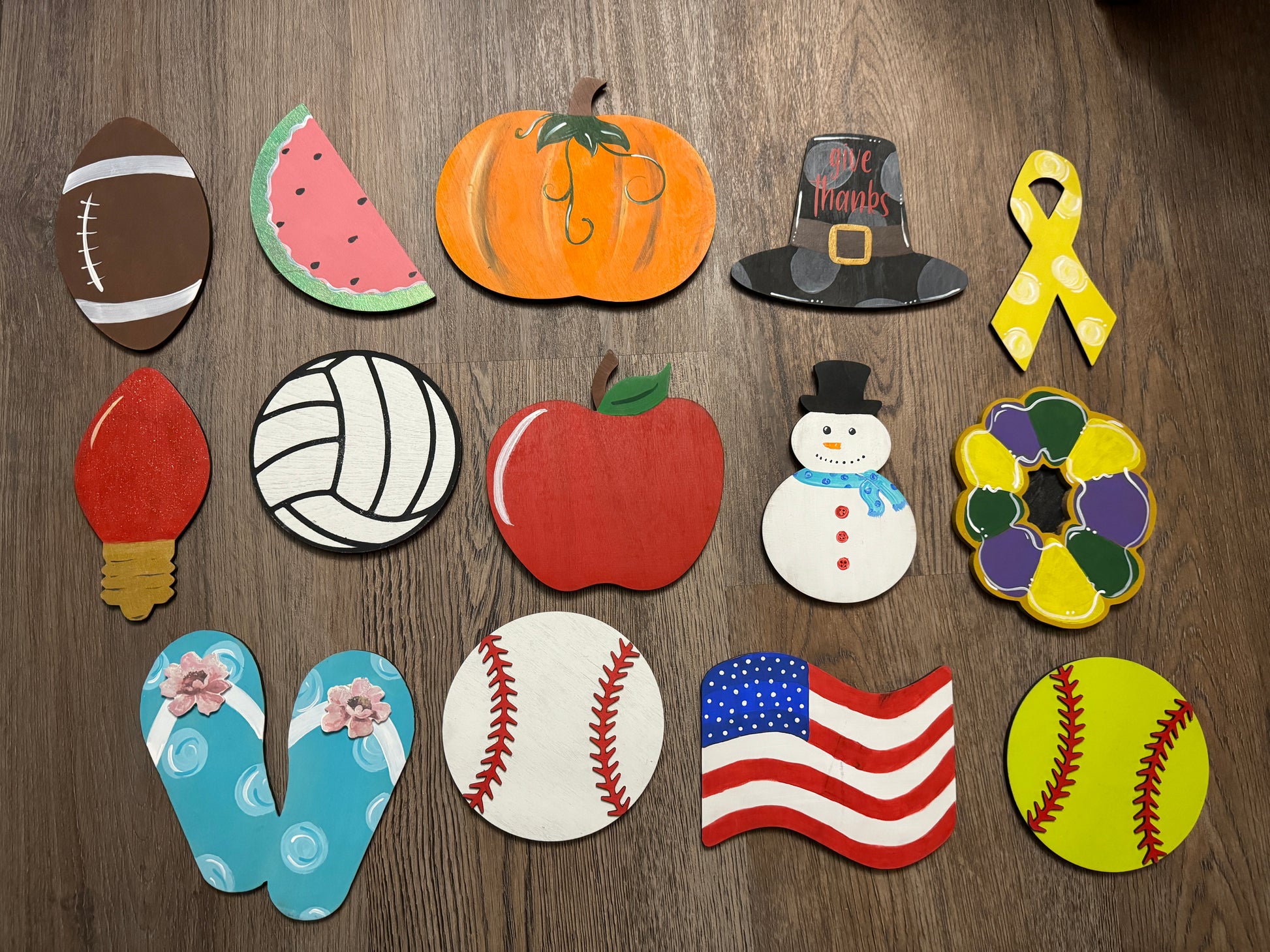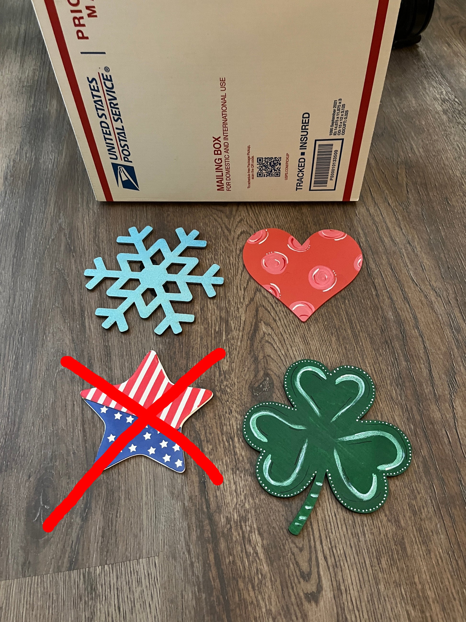 If you are purchasing a shape for your interchangeable sign, your first shape is FREE (no discount code needed). All additional 6 inch shapes are $7 each, 4 inch shapes are $6 each. All DIY unpainted/unassembled options are $5 each.