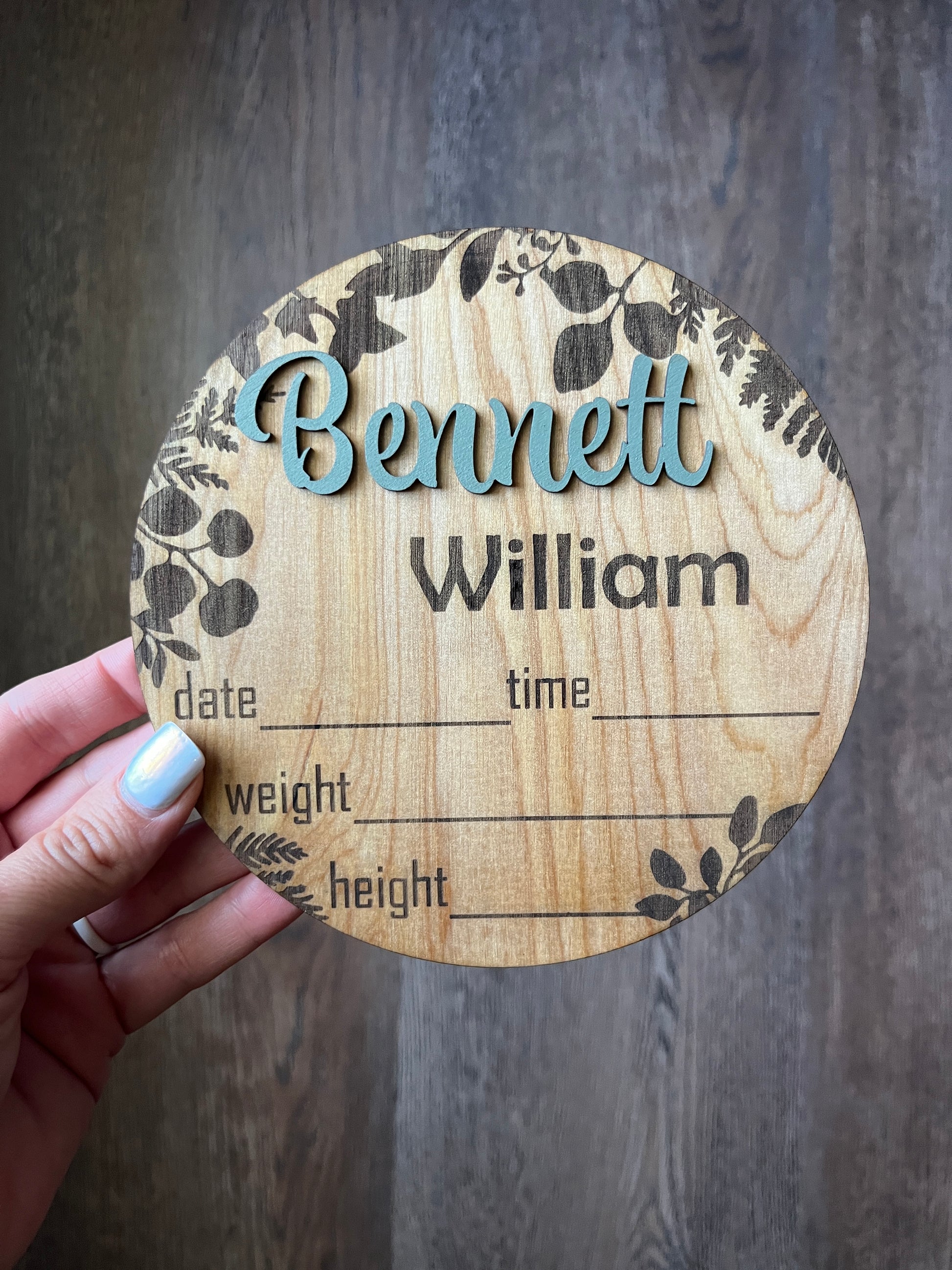 This natural wood colored keepsake is a decorative little reminder of the first few moments your baby was born. It's offered in 3 different sizes so you can choose how you want to display it. The leaves and middle name are engraved while the first name is made of painted, raised letters (which is available in many different colors). You can fill in the information yourself with a paint pen or permanent sharpie OR I can engrave the details for you (+$5). Please specify you're baby's name (and stats, optional) in the "order special instructions box" on the cart screen before checkout.