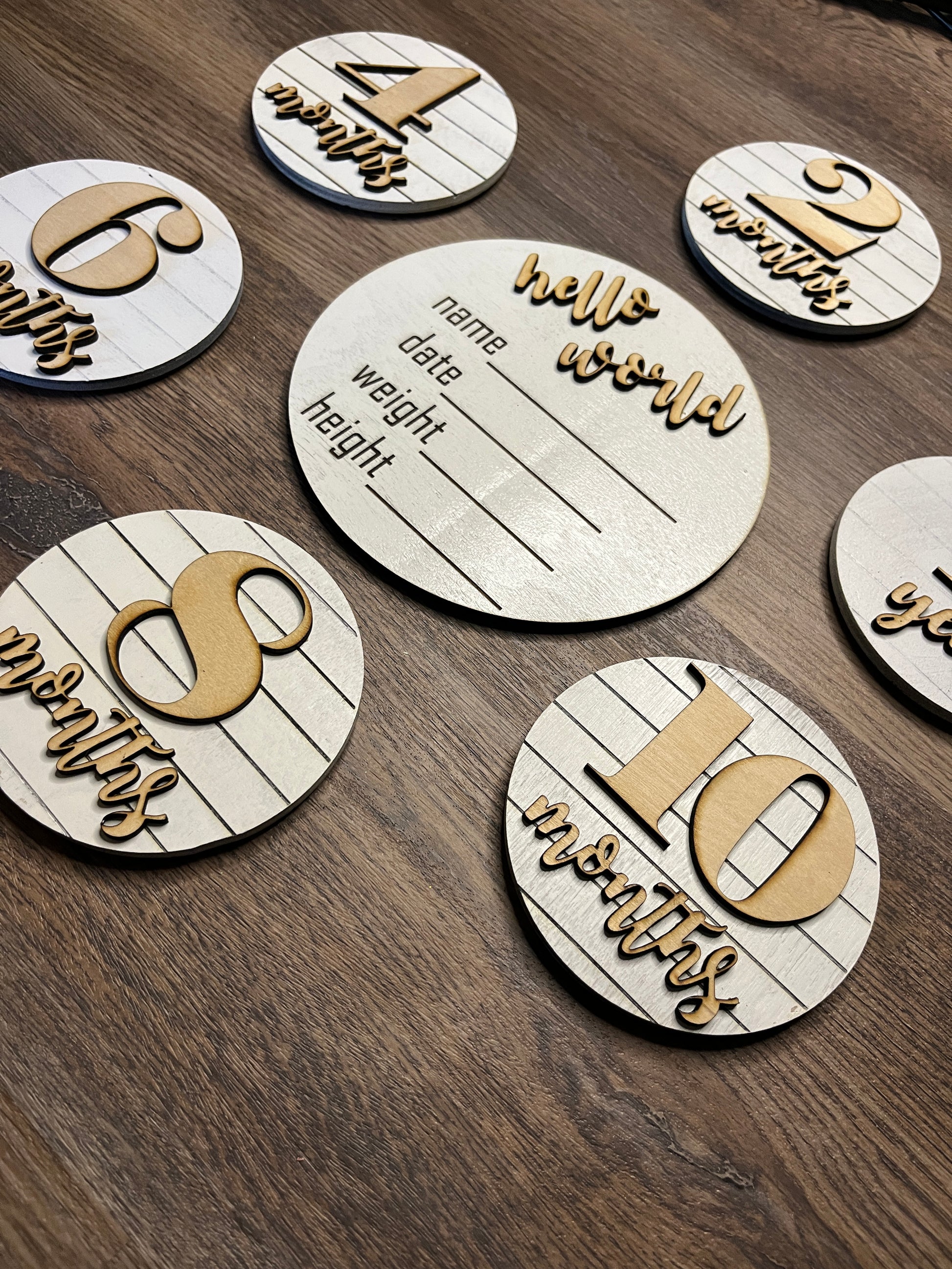 The birth stats plaque is 6 inches wide and can be written on with a permanent sharpie or paint pen. Each monthly plaque is 4 inches wide and double sided.