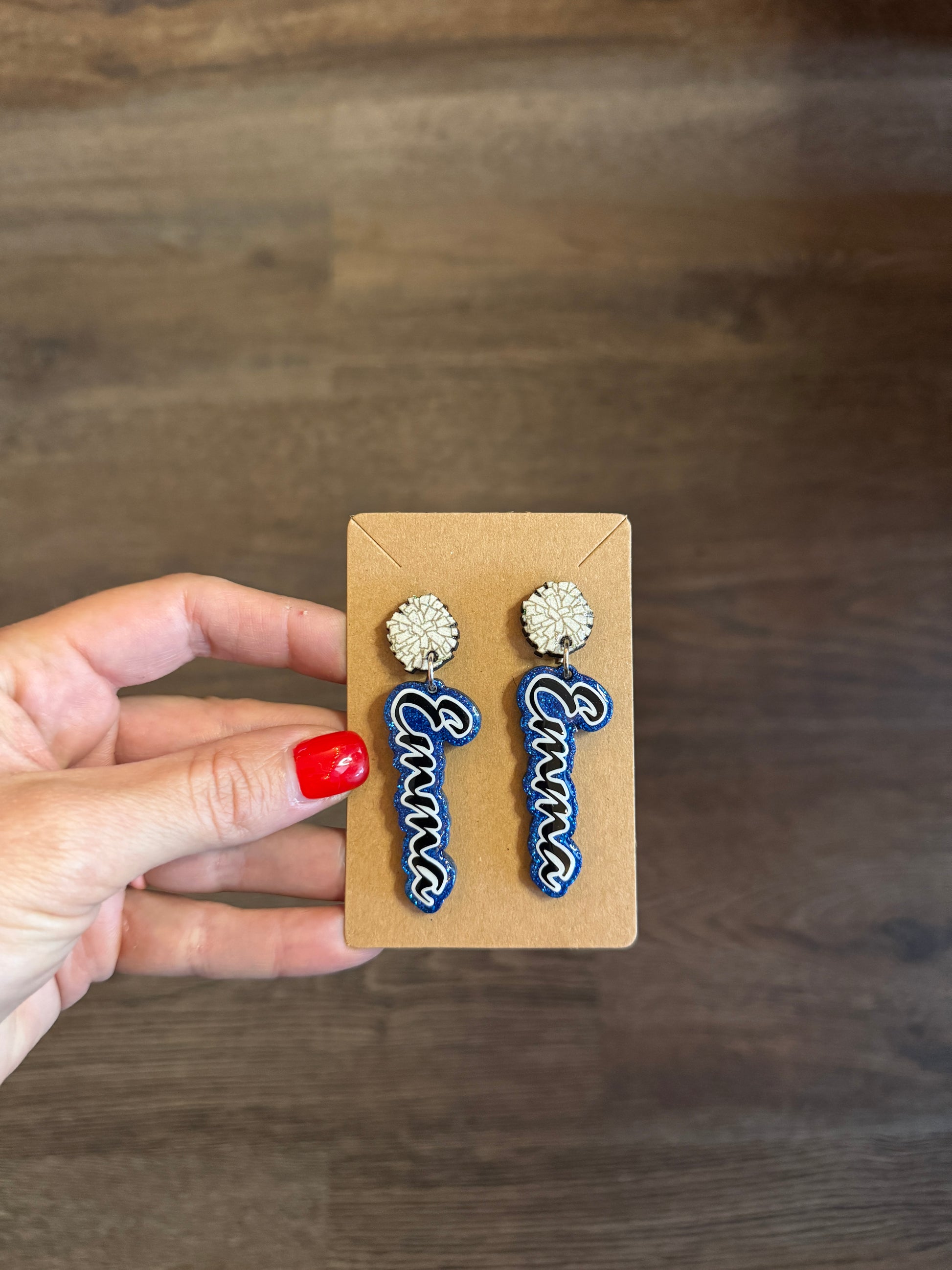 These sparkly earrings are perfect for supporting your lil cheerleader during competitions and showcases. They are resin coated so they have a glossy protective finish. There are 2 different styles you can choose between: no pompom with just the name on a stainless steel hook, or pompom hypoallergenic stud with name. Please make sure to write the name you want in the "order special instructions" box in your cart.