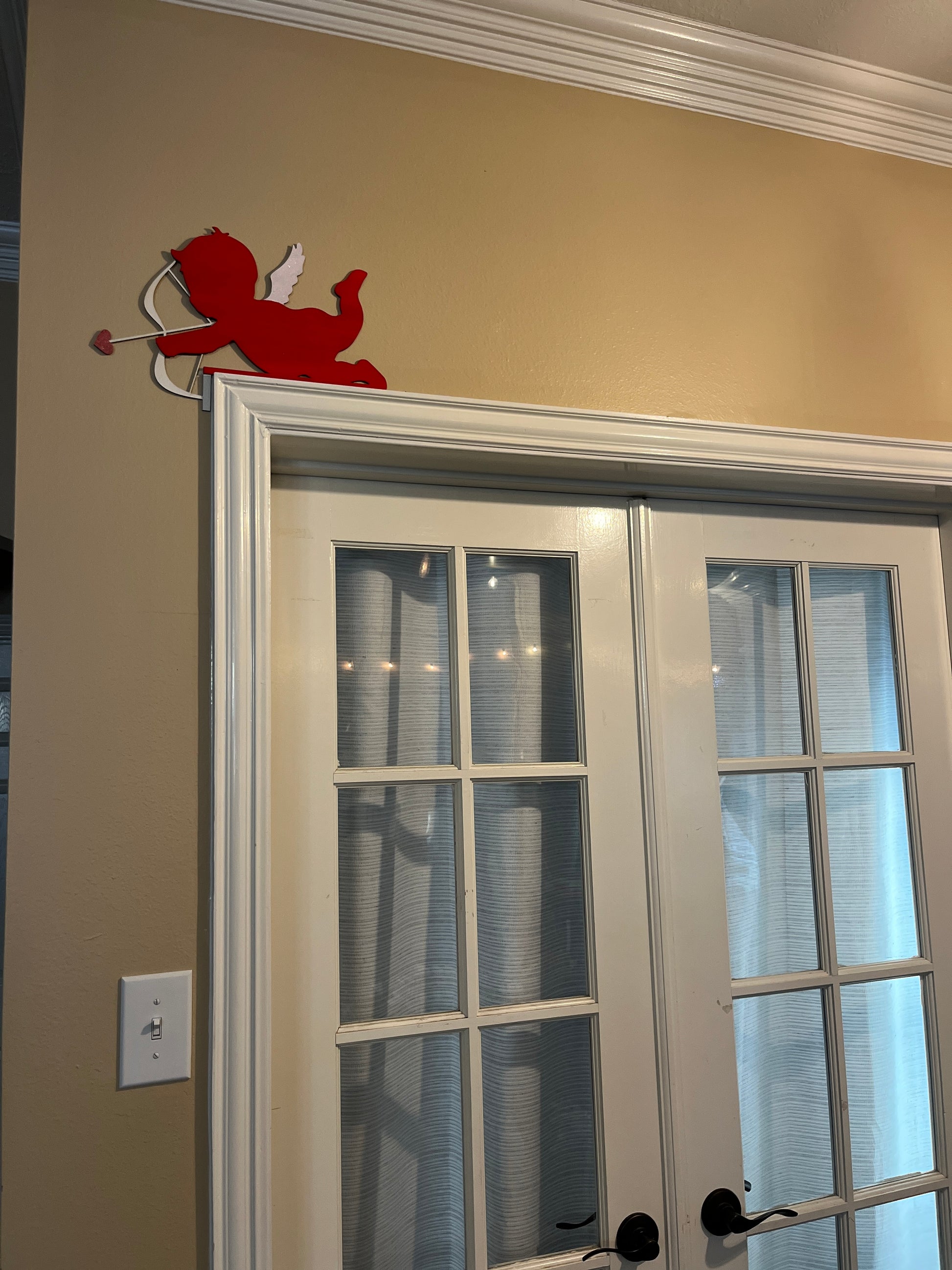 15"x10" laser cut cupid sits on the corner of your door frame without hardware or adhesives. Choose between a left facing cupid or a right facing one.