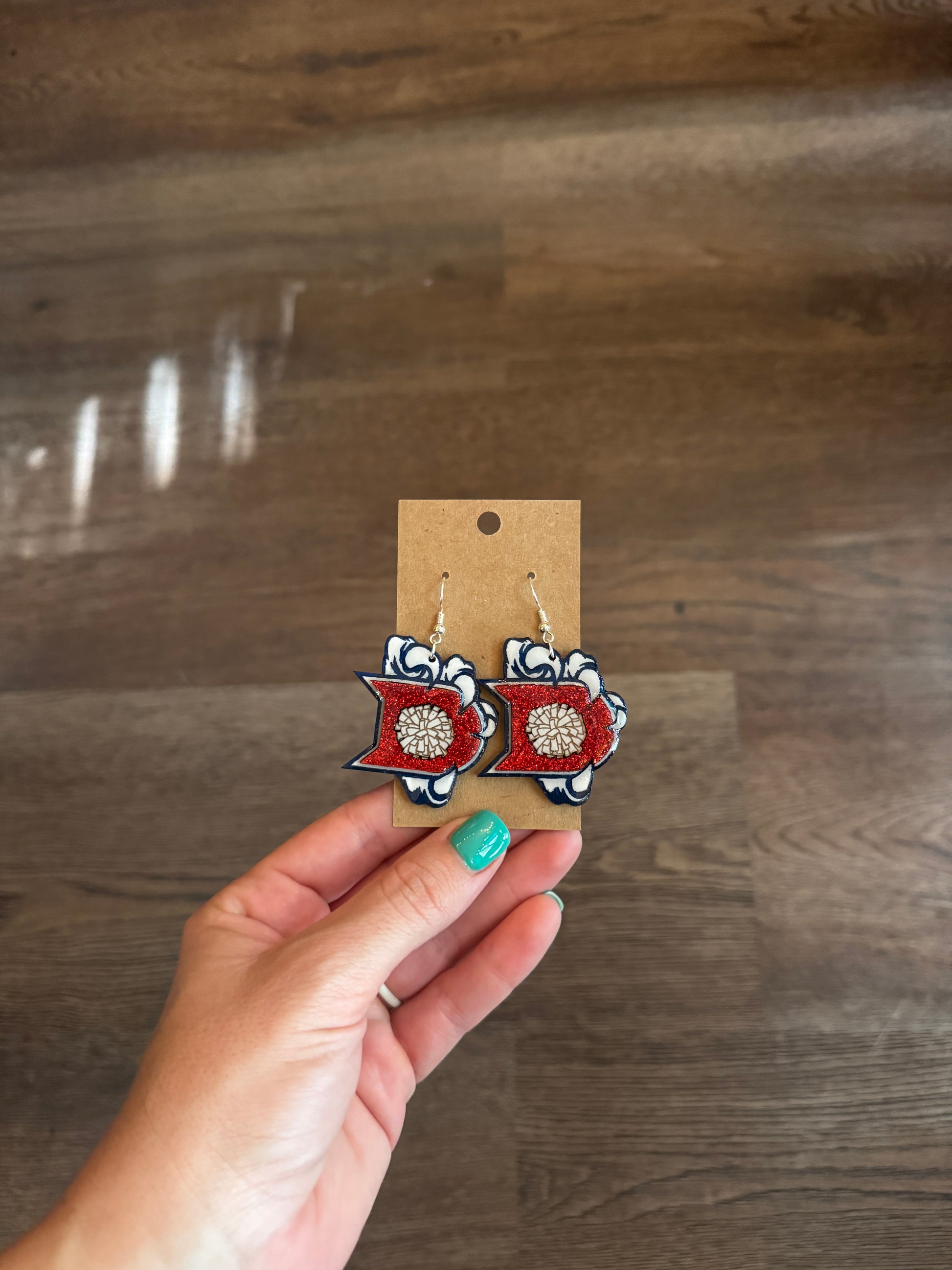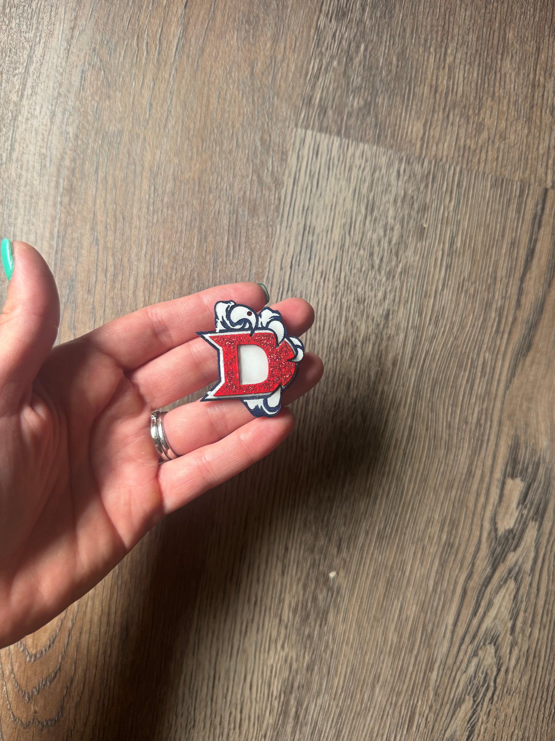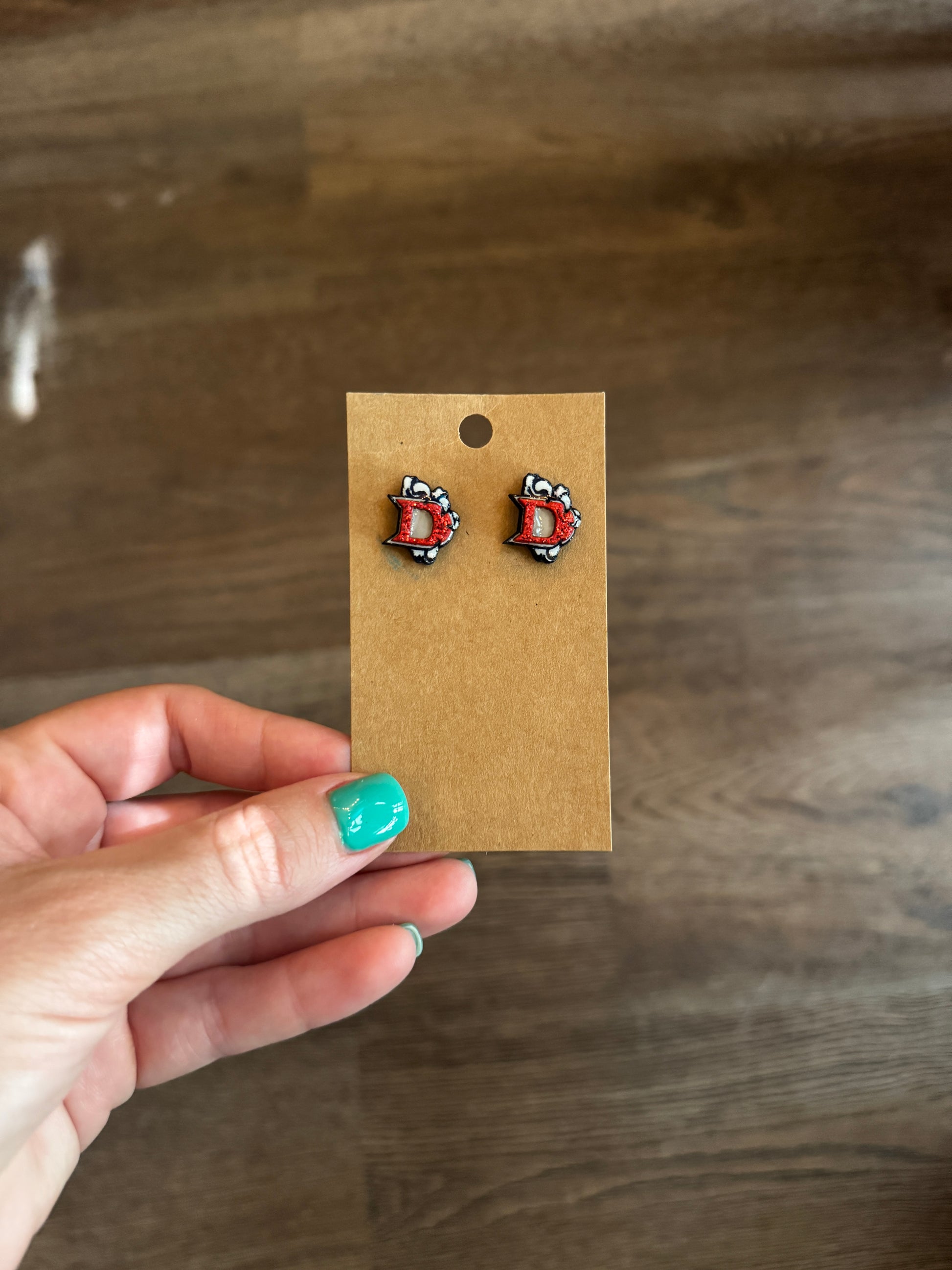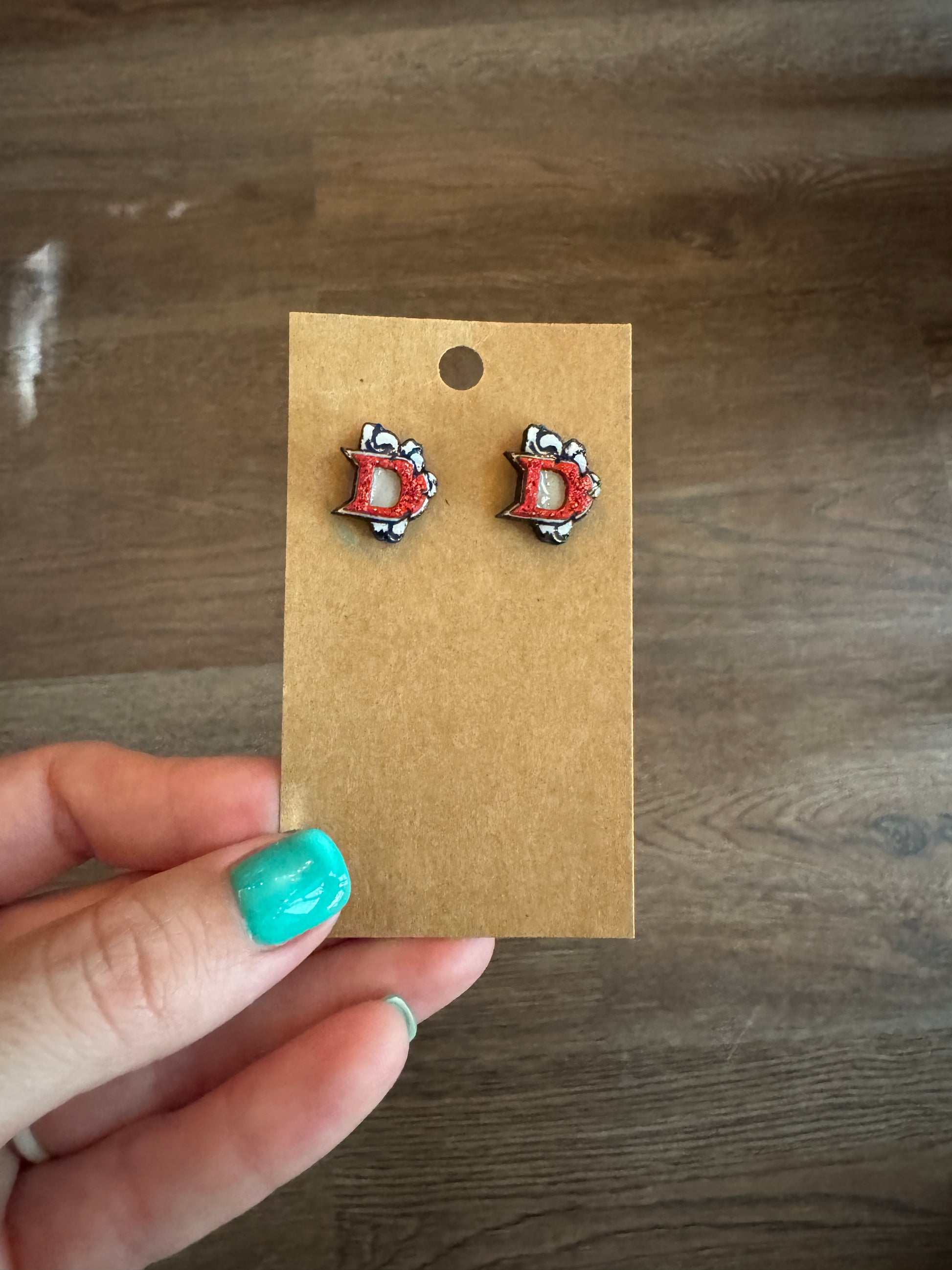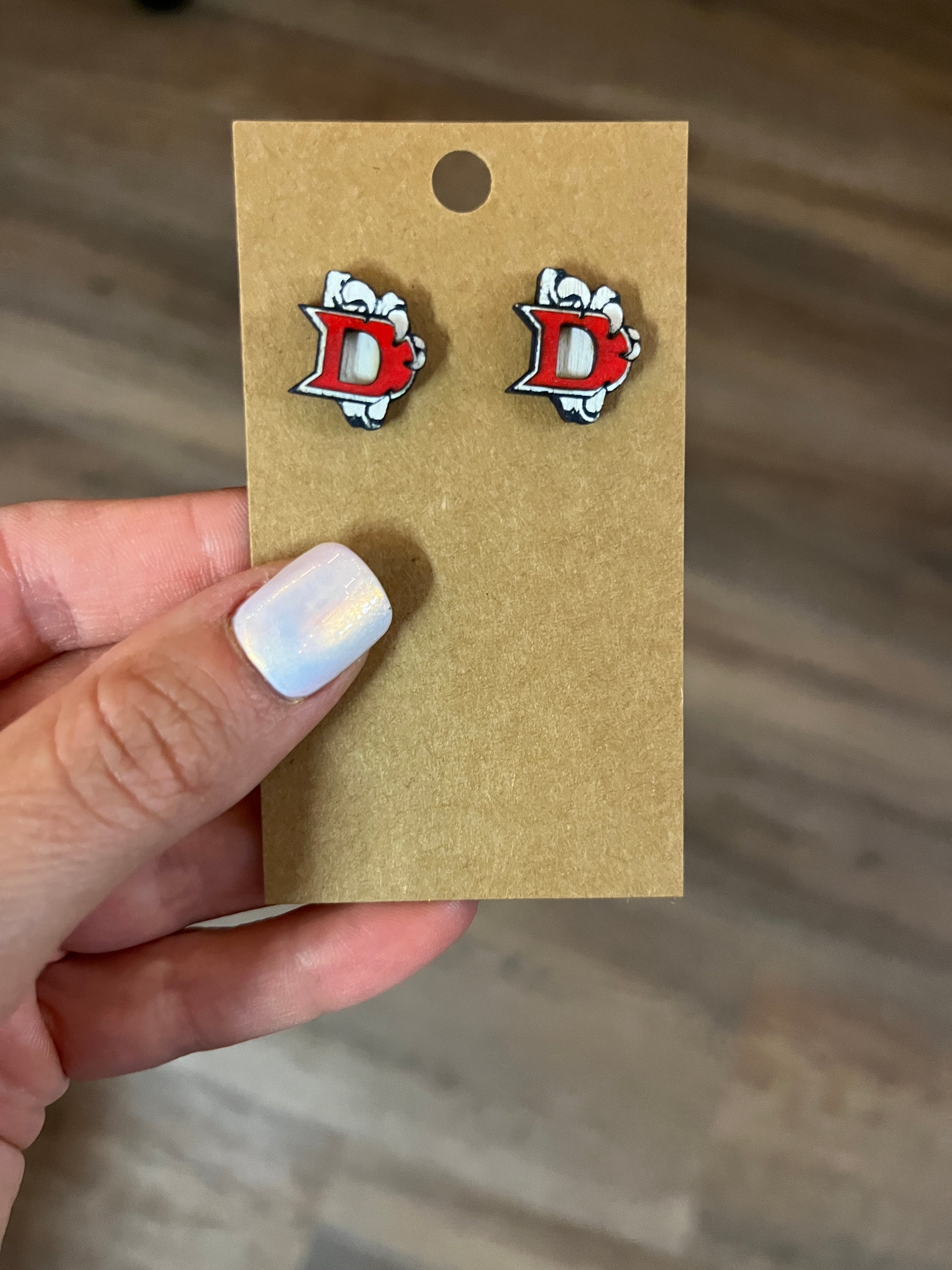 Choose between the 0.5" plain D stud, the 1.75" hanging eagle claw, or the 0.5" eagle claw stud. UPDATE: all earrings now have a glittery "D" and epoxy coated to protect the design with a glossy hard finish.