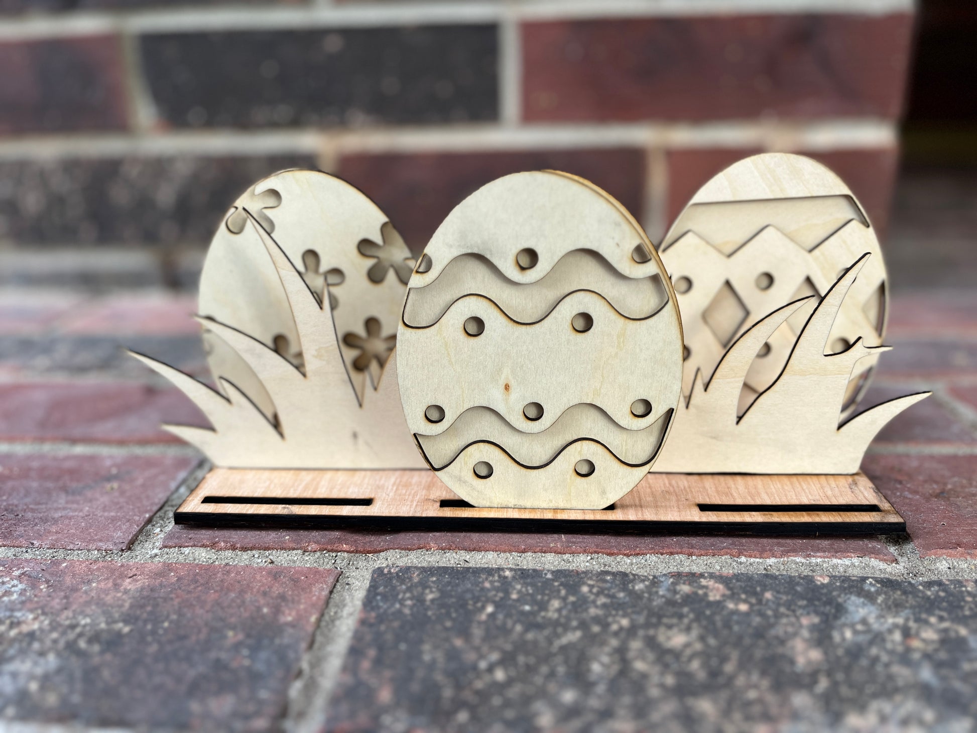 This Easter egg display kit has 8 unpainted pieces which includes a base to arrange all your pieces in any way you like. The paint set comes with 3 eggs, grass, a base for displaying, paint, glue, and a brush.