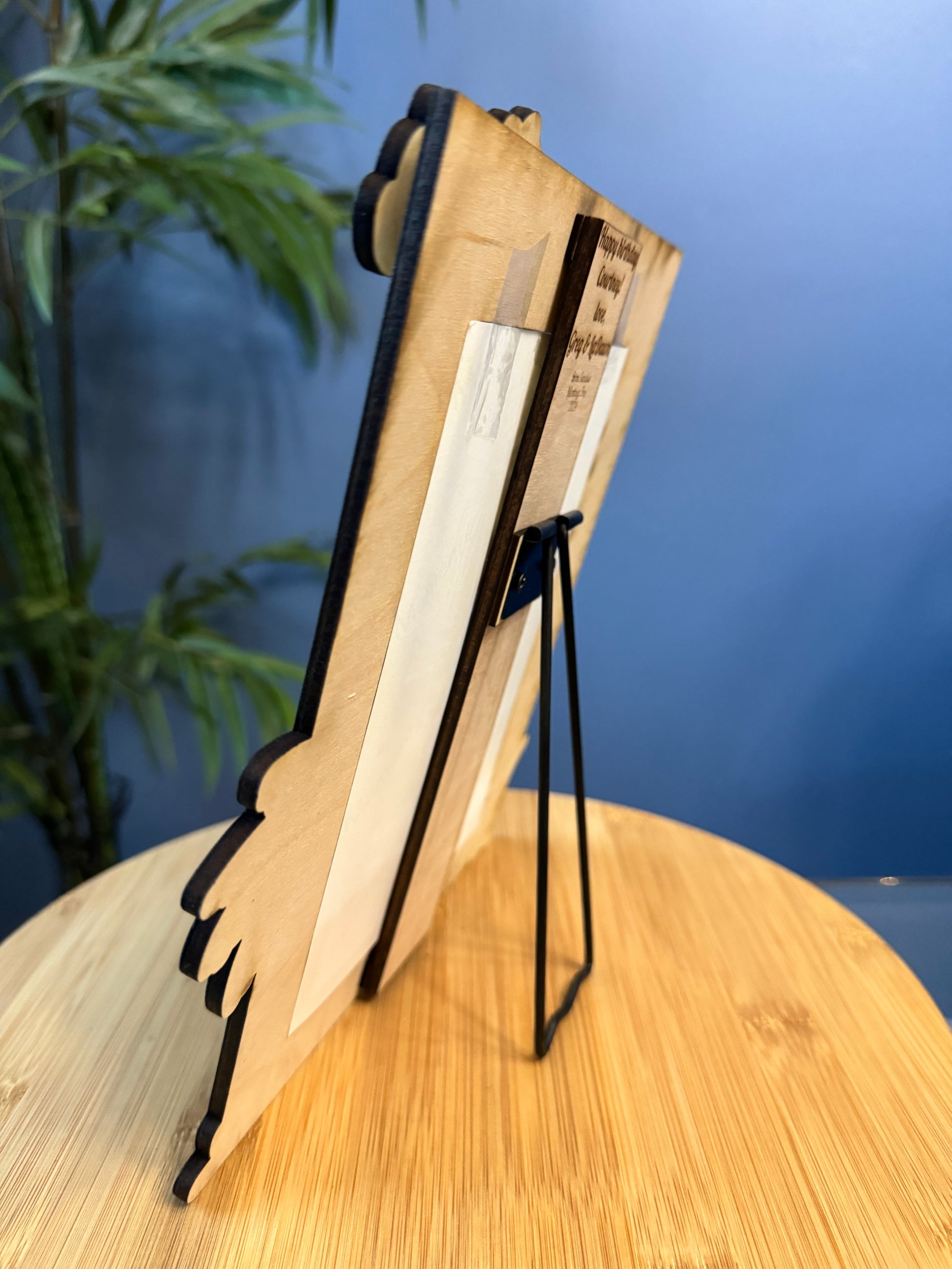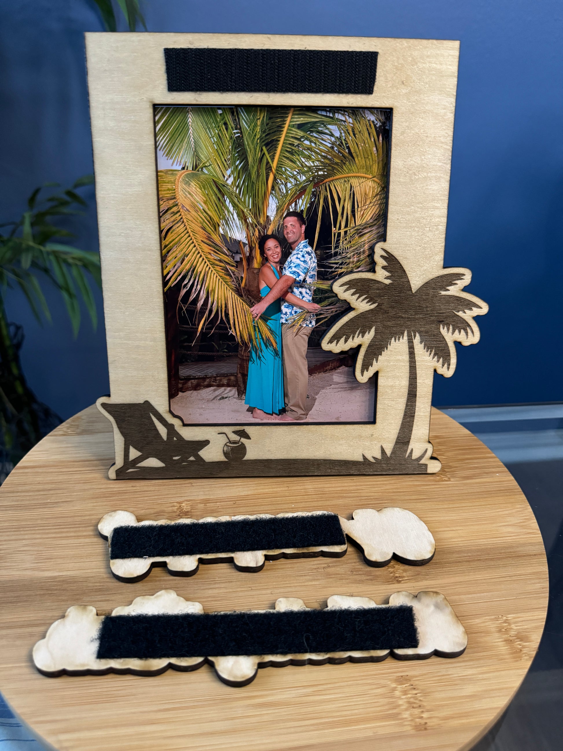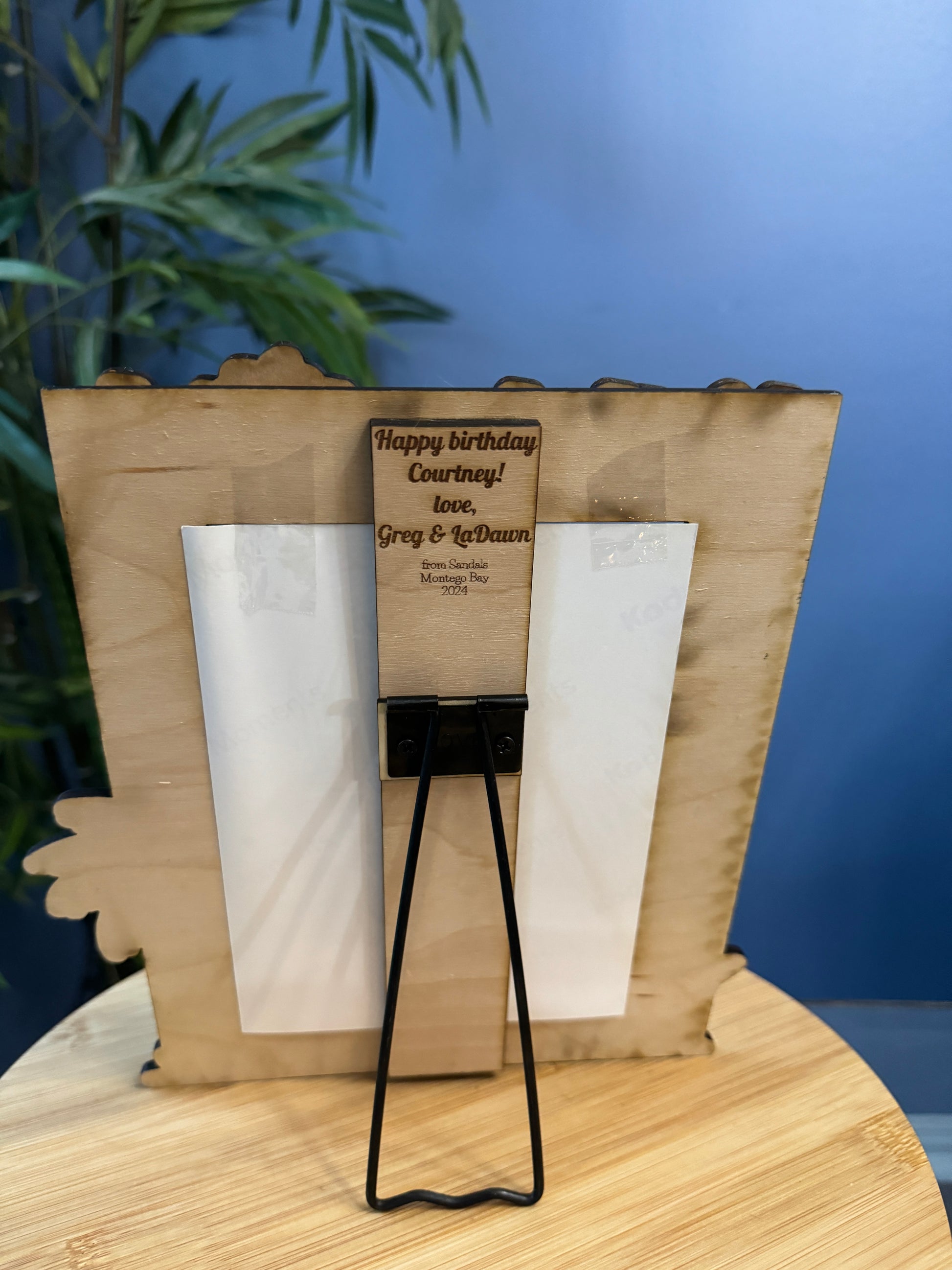This 9" tall wooden frame holds a 5x7 photo and comes with 2 velcro phrases of your choice.