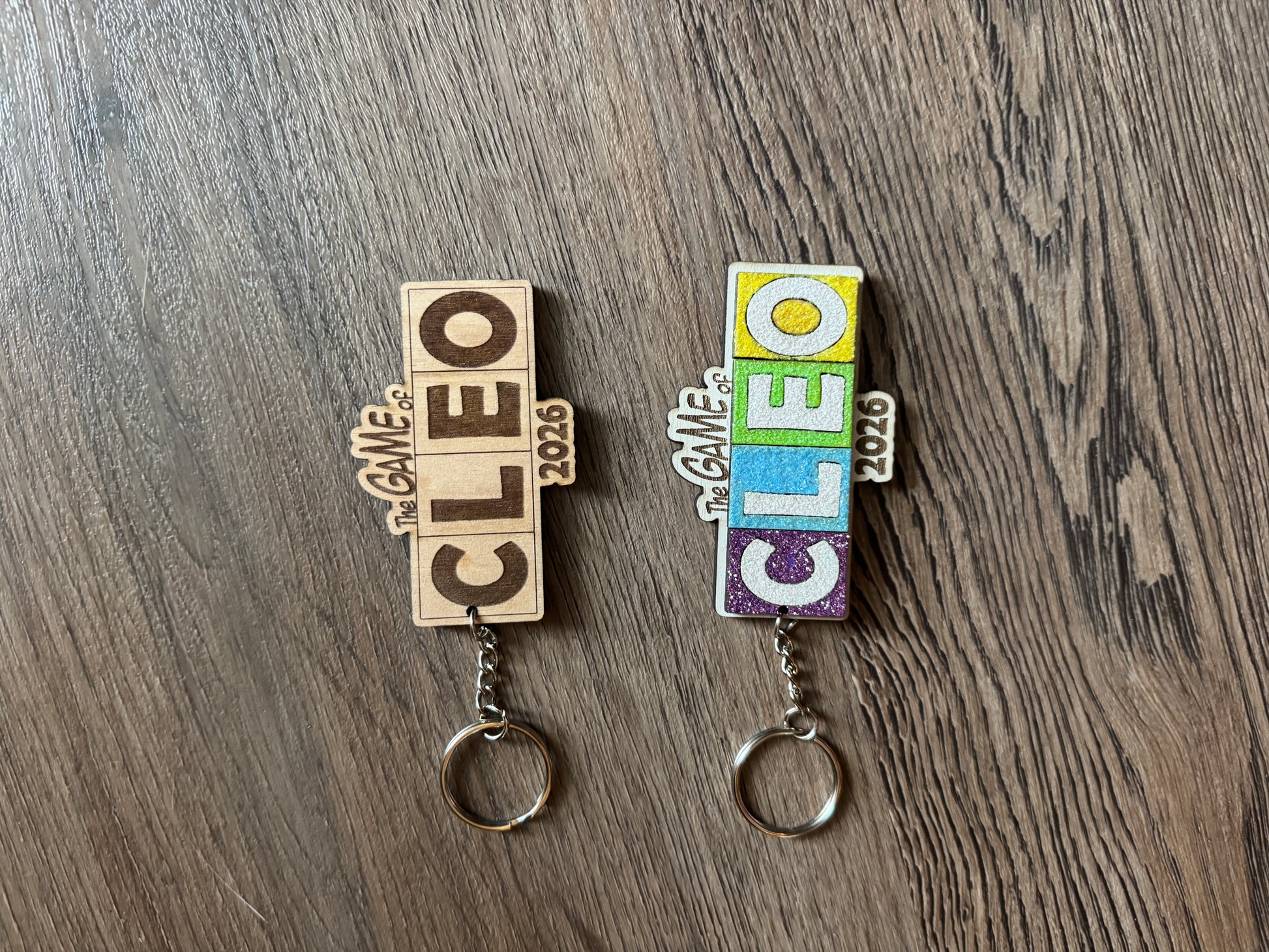 This glittery 3" keychains are made of 2 layers of laser cut wood and sealed to prevent a glittery mess. It makes a unique throw for the Cleopatra Krewe and can be ordered individually or in bulk. Choose between they keychain or magnet (which is very strong!) version.