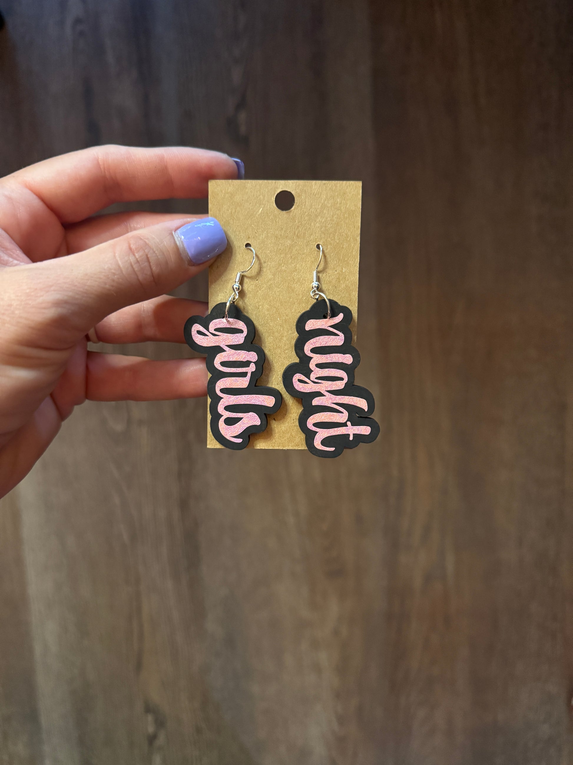 These shimmery pink girls night earrings are made of laser cut wood and hung on hypoallergenic hooks. They are also epoxy coated to give a it a glossy protective finish. They are a great accessory for a girls night out, Mardi Grass costume, or float throw. Choose your count to get discounted pricing on bulk options.