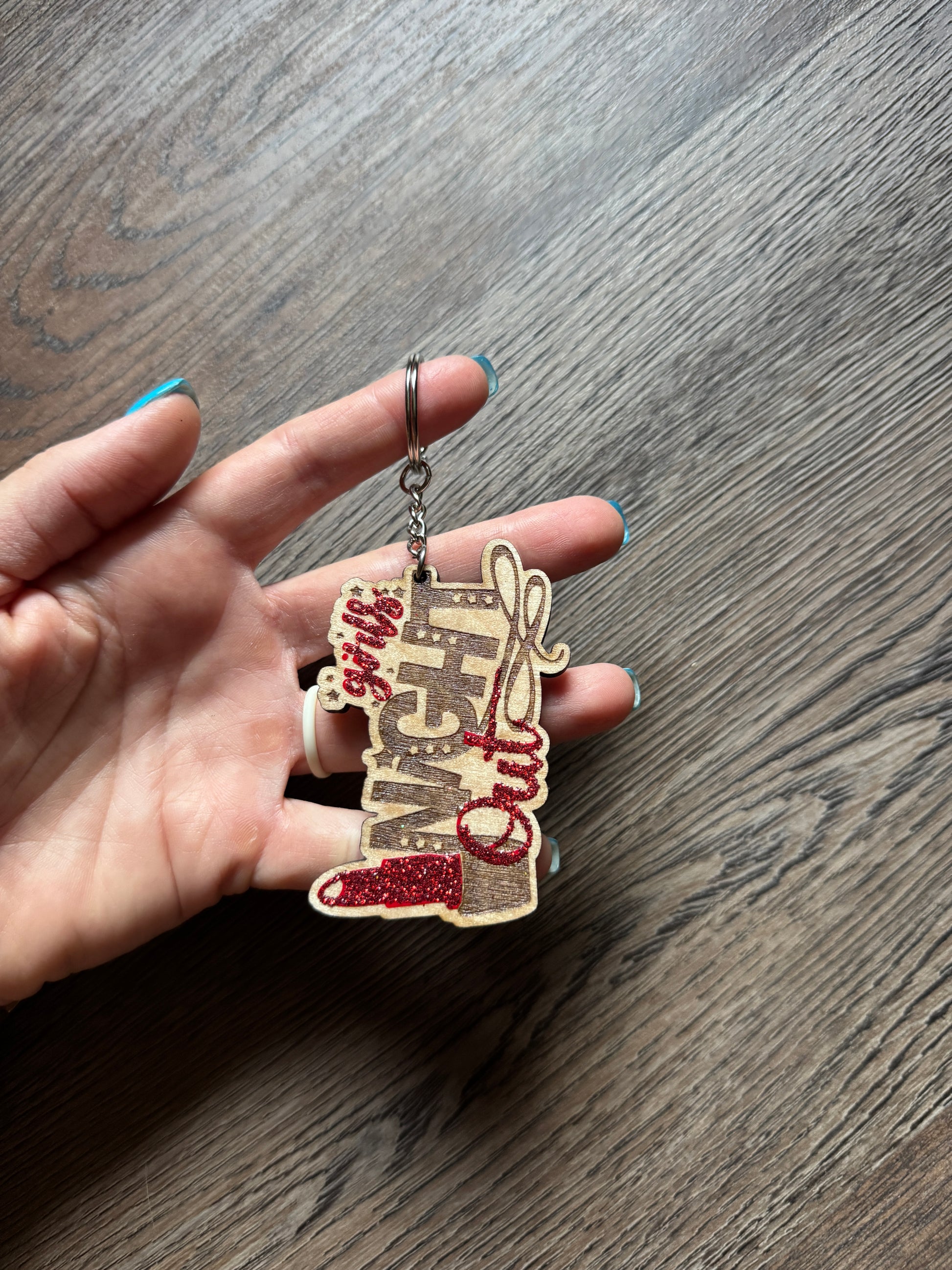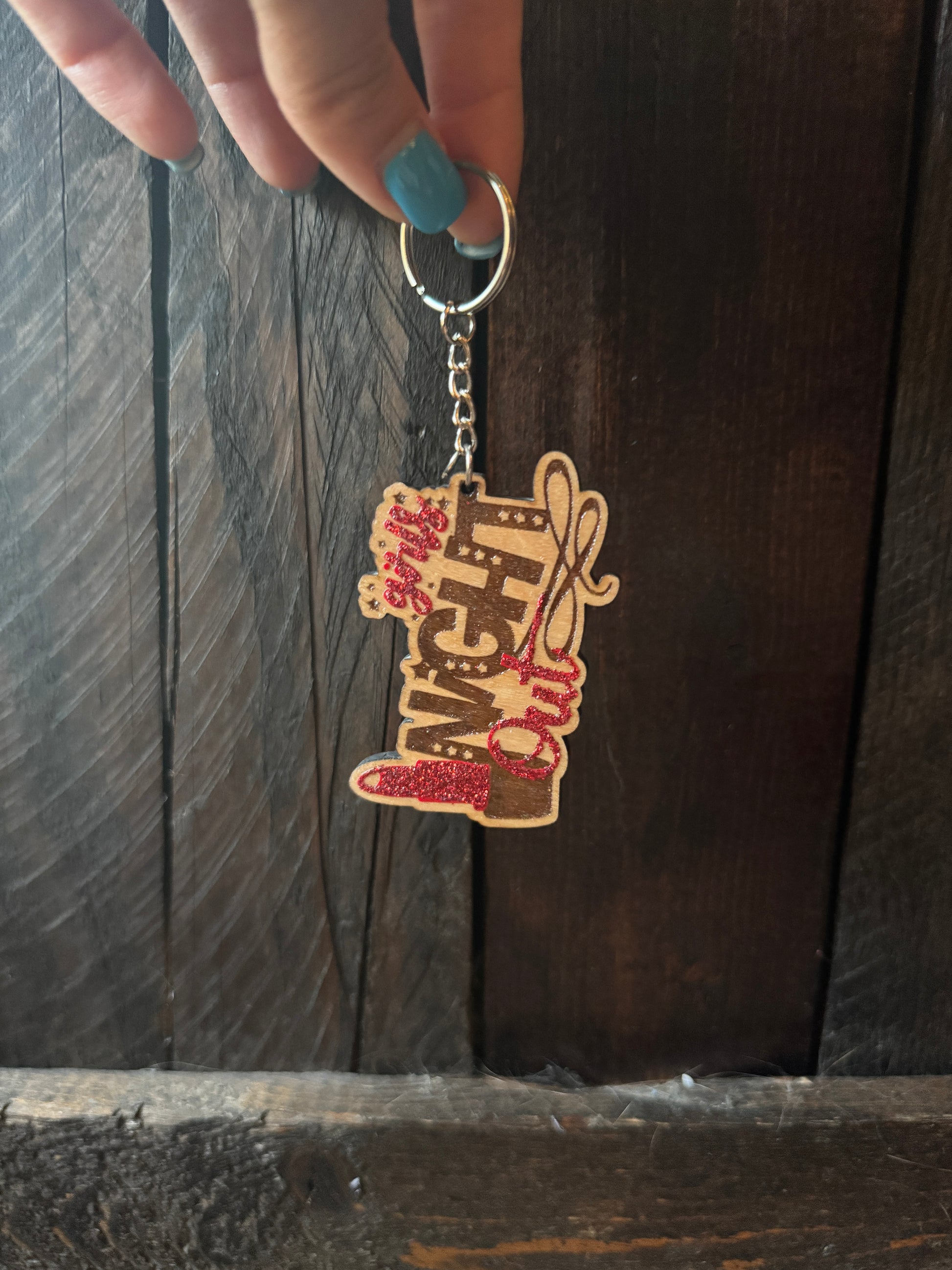 It's engraved, laser cut wood with a sealer on top the glittery design. Choose between the keychain version or the magnet on back.