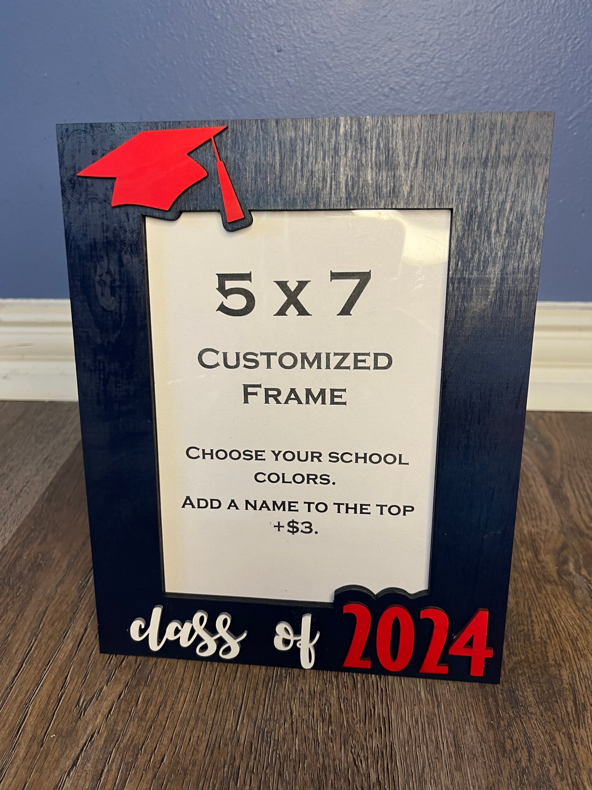 This picture frame holds a 5x7 photo and stands upright with a kickstand on back. This can be made with any year on the front so you can swap out their school pics each year leading up to graduation.