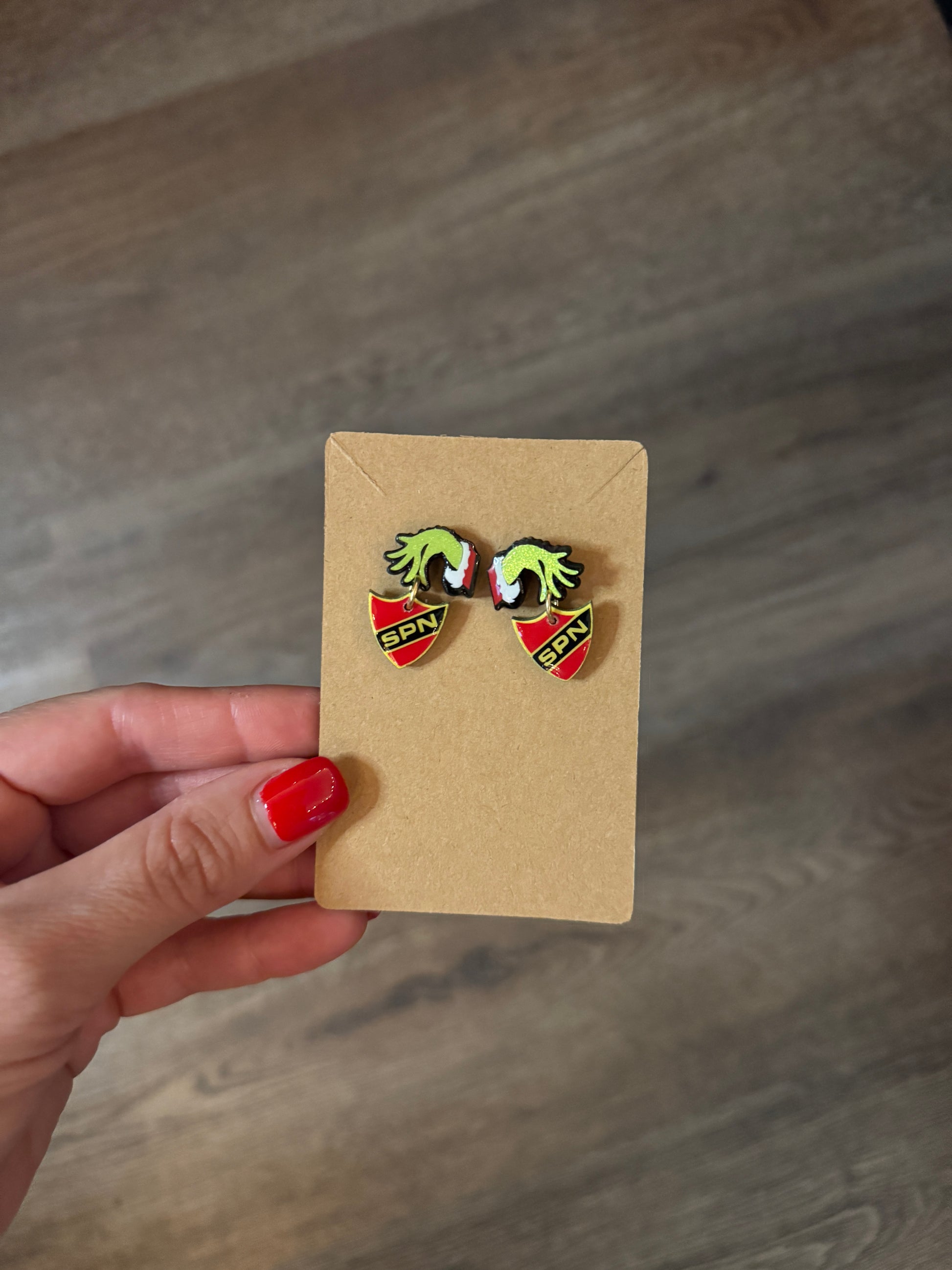 These Christmas earrings have hypoallergenic posts on the back with a shimmery ornament hanging from the hand. They are laser cut, engraved, painted, and epoxy coated to add a nice glossy finish to your festive accessories.