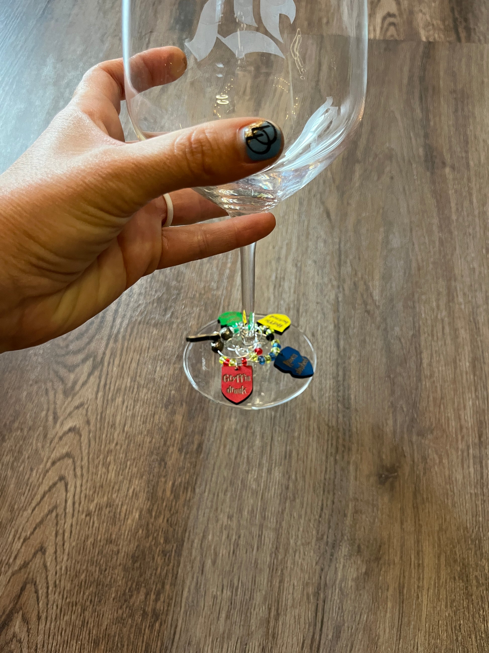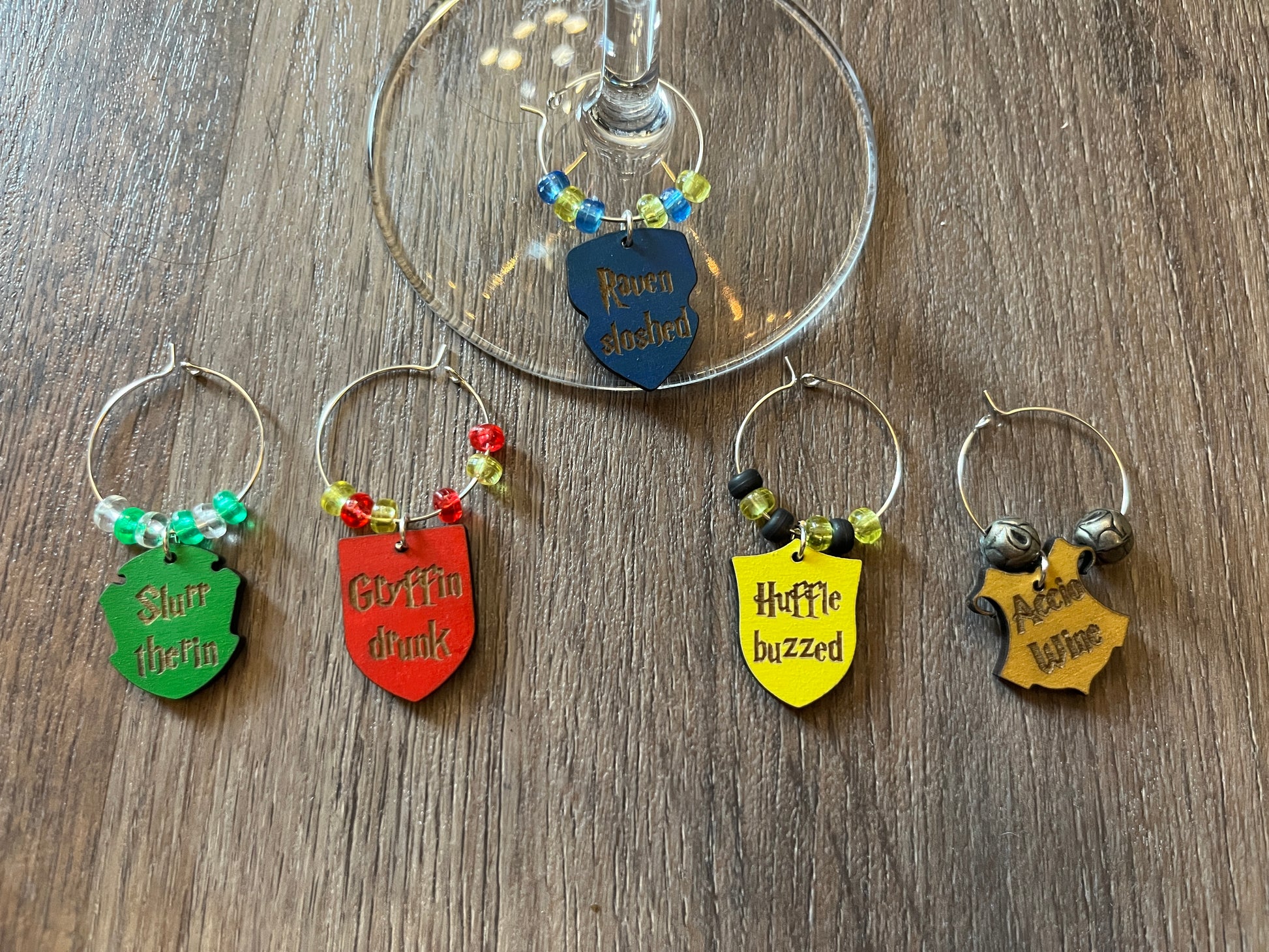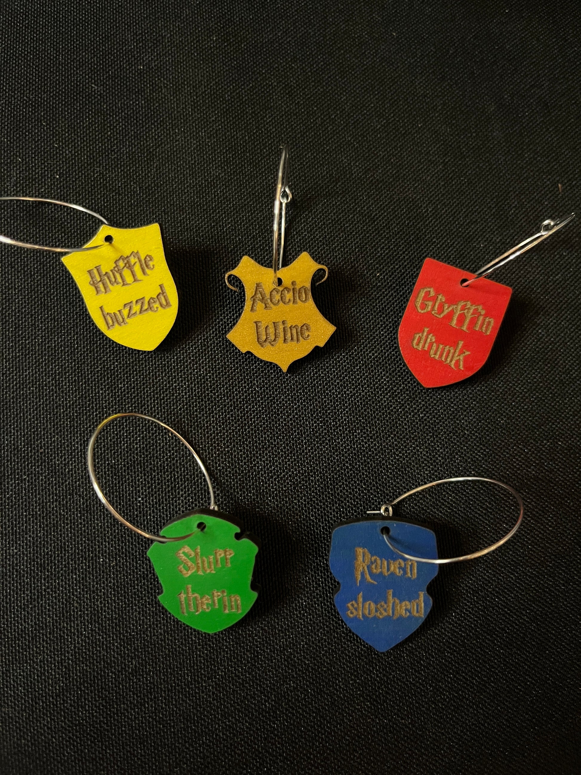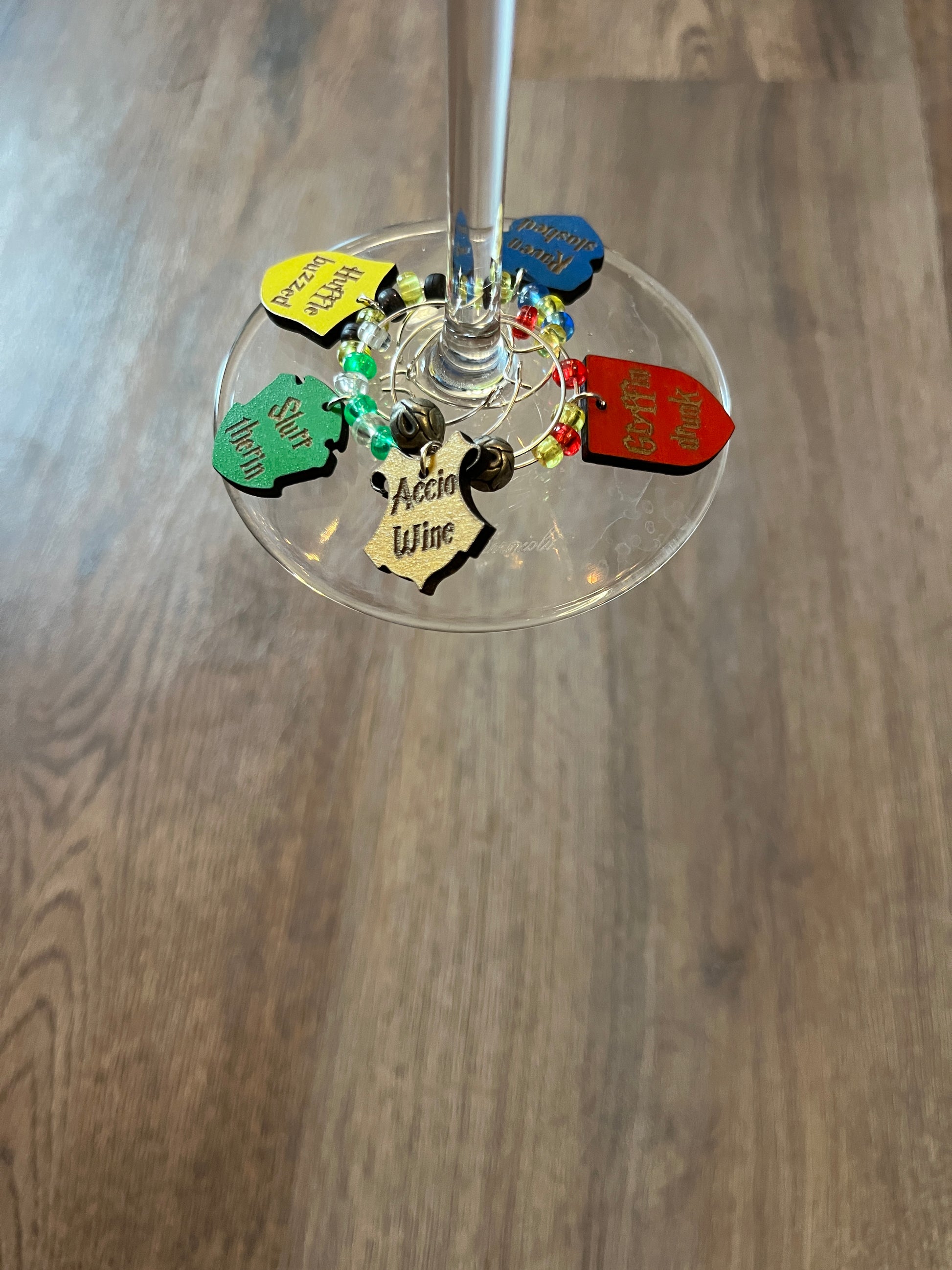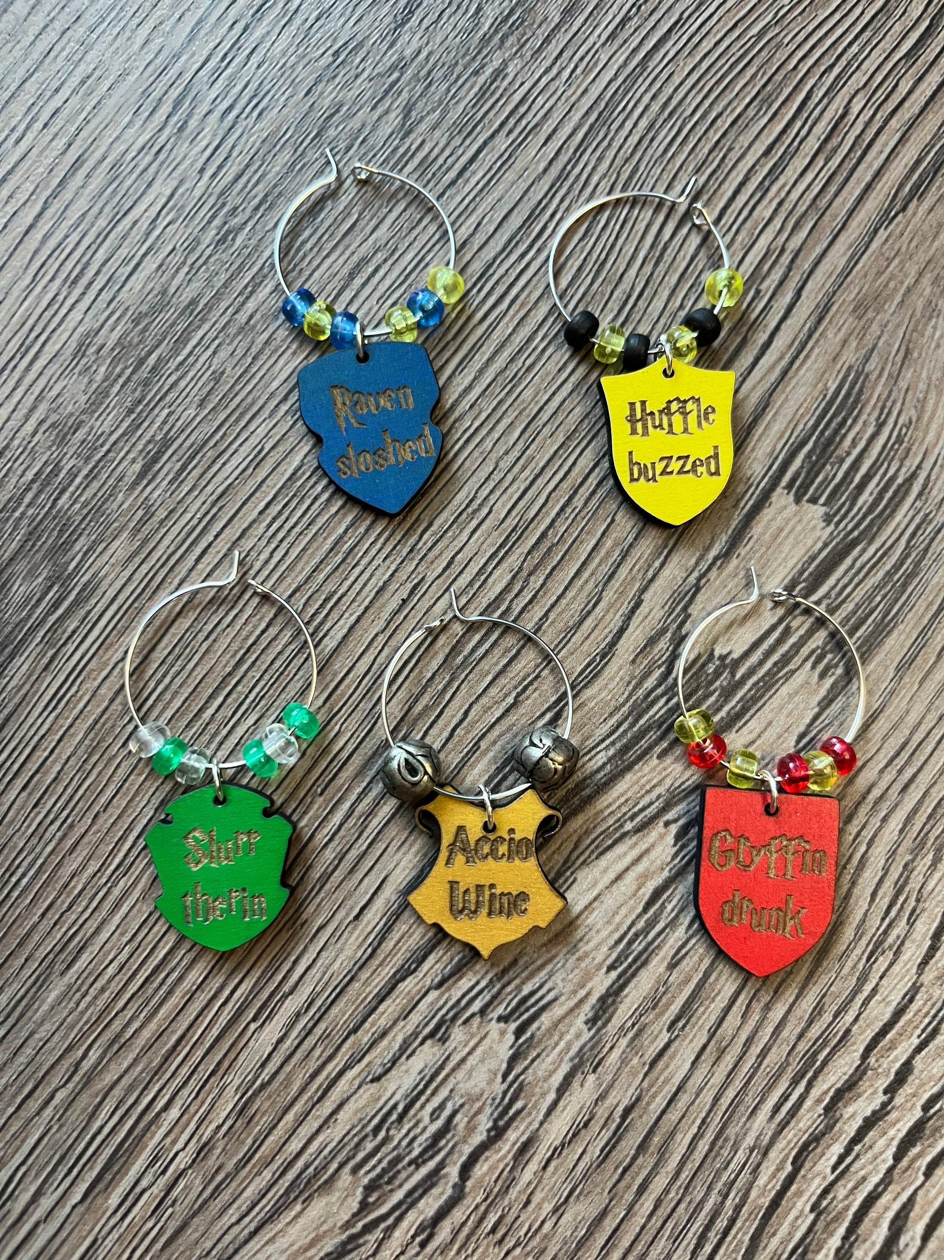 These wizard themed 1" wine charms are perfect for identifying you glass in social settings. Whether you're just hanging out with friends or you're throwing a HP themed party, these funny drinking puns are a cute addition to your drink.
