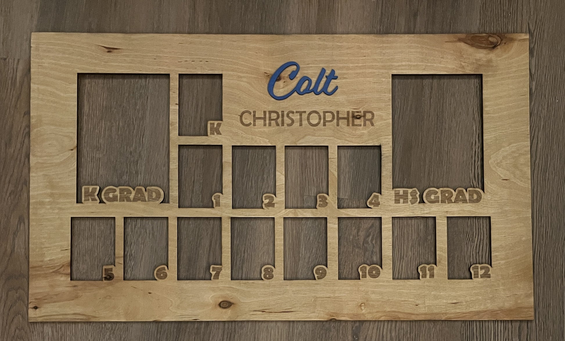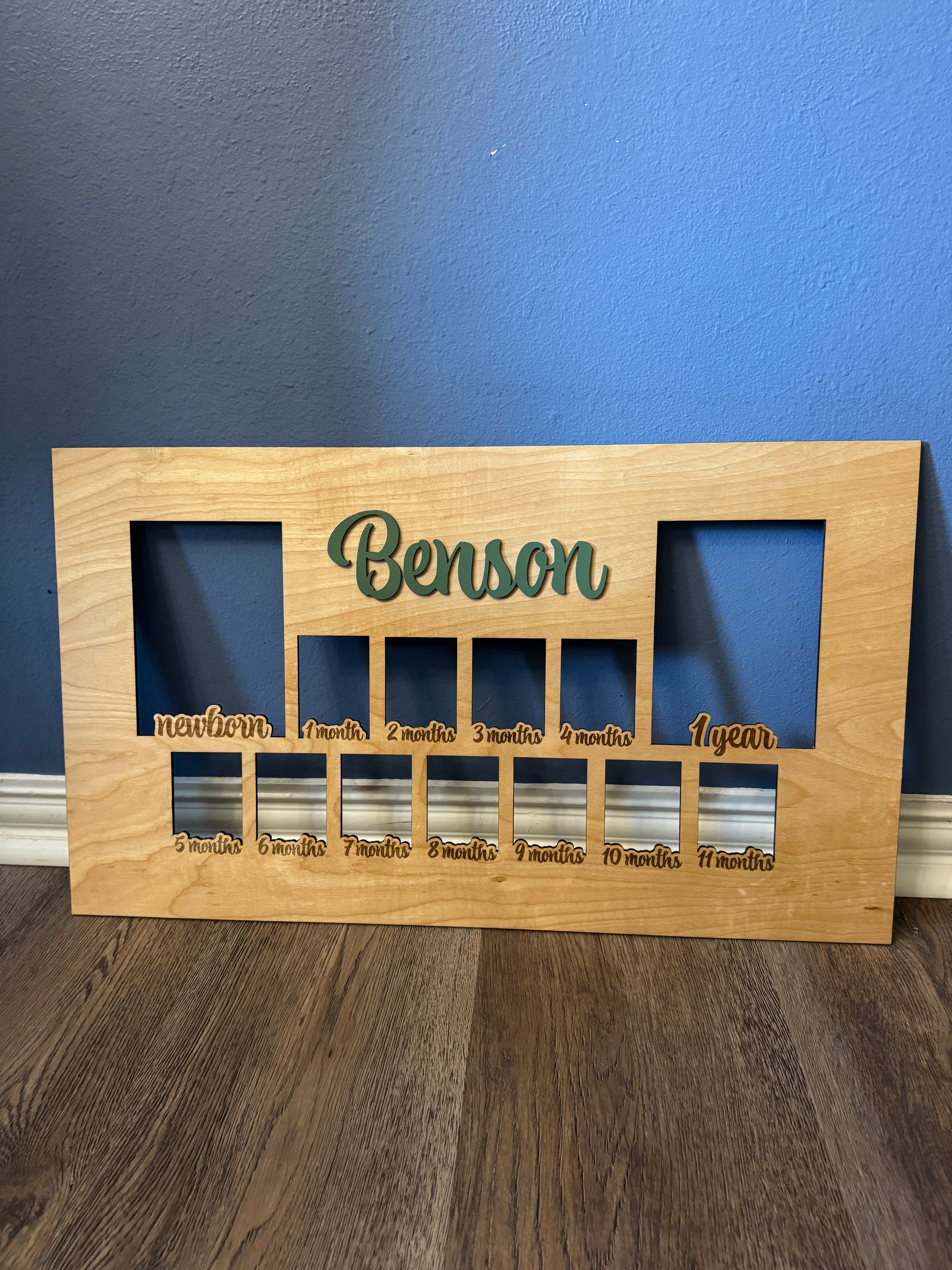 Choose between the school age frame (23"x12"), the toddler frame (17"x8"), or the 1st year frame (23"x12", broken down month by month; not pictured on website yet).