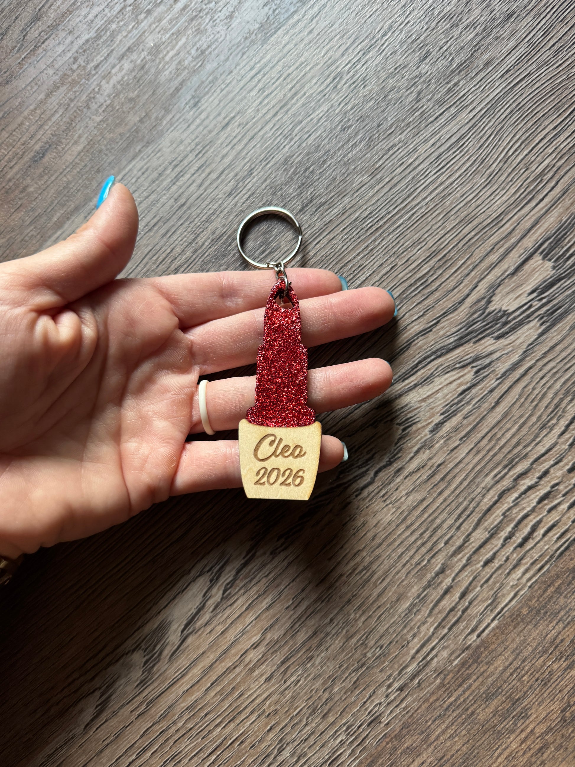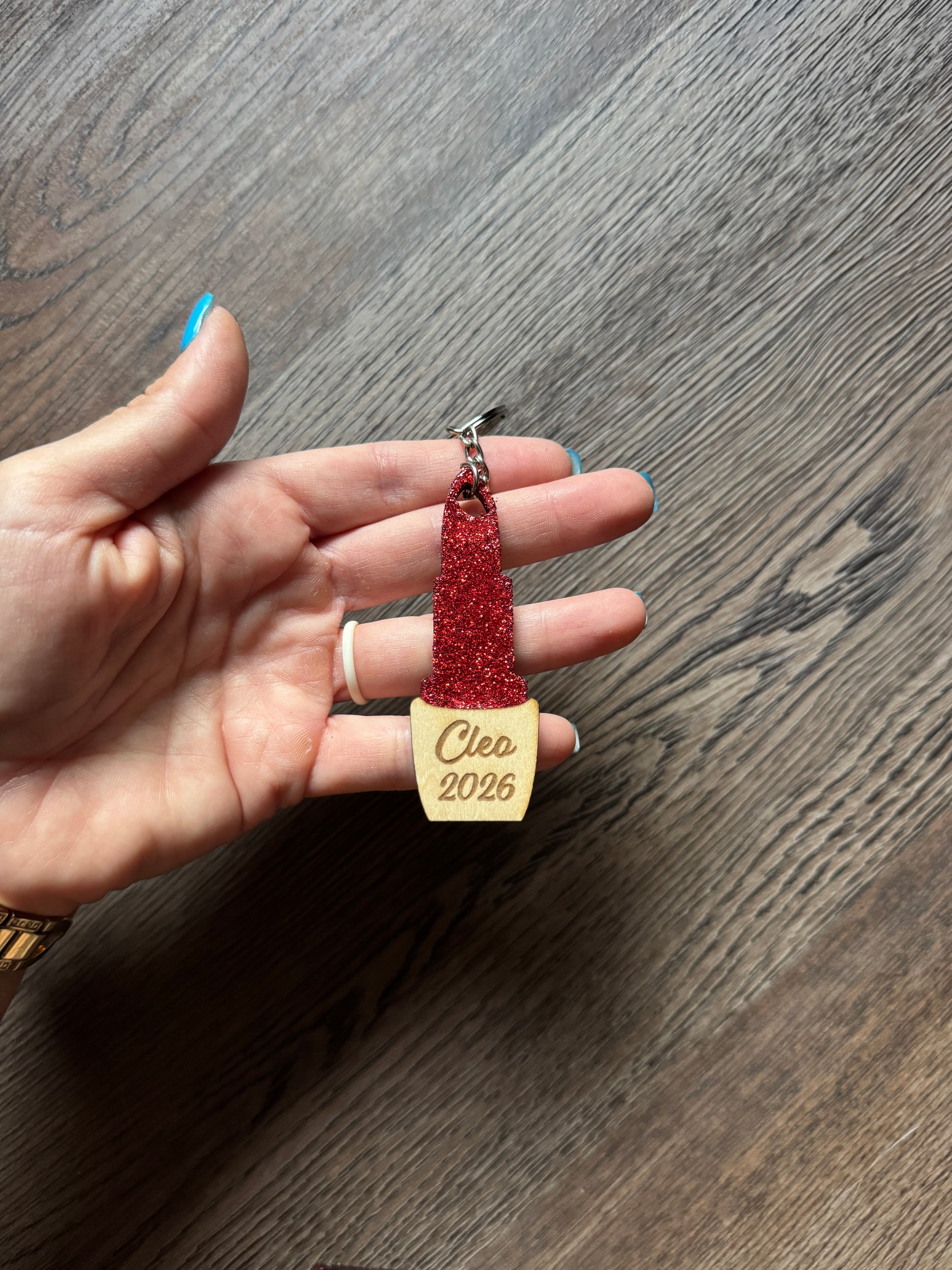 This glittery lipstick is available as a keychain or earrings. They make a unique throw for riding in the parade or for accessorizing your costume as a rider. They are made of laser cut wood and the earring hang from a hypoallergenic hook.