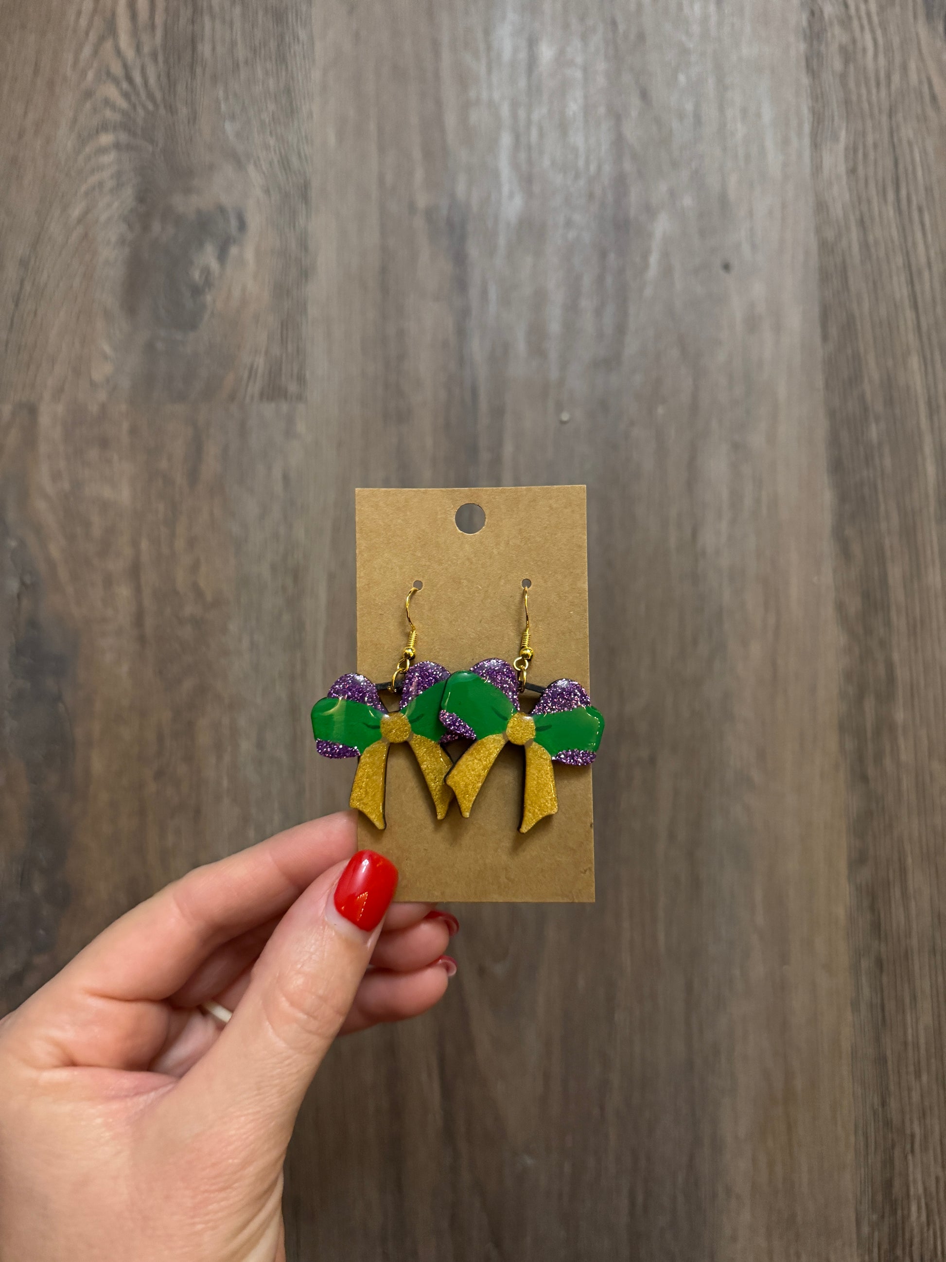 Hand painted, wooden earrings with Mardi Gras colors and glittery accents. They are sealed with an epoxy resin to give it a glossy finish.