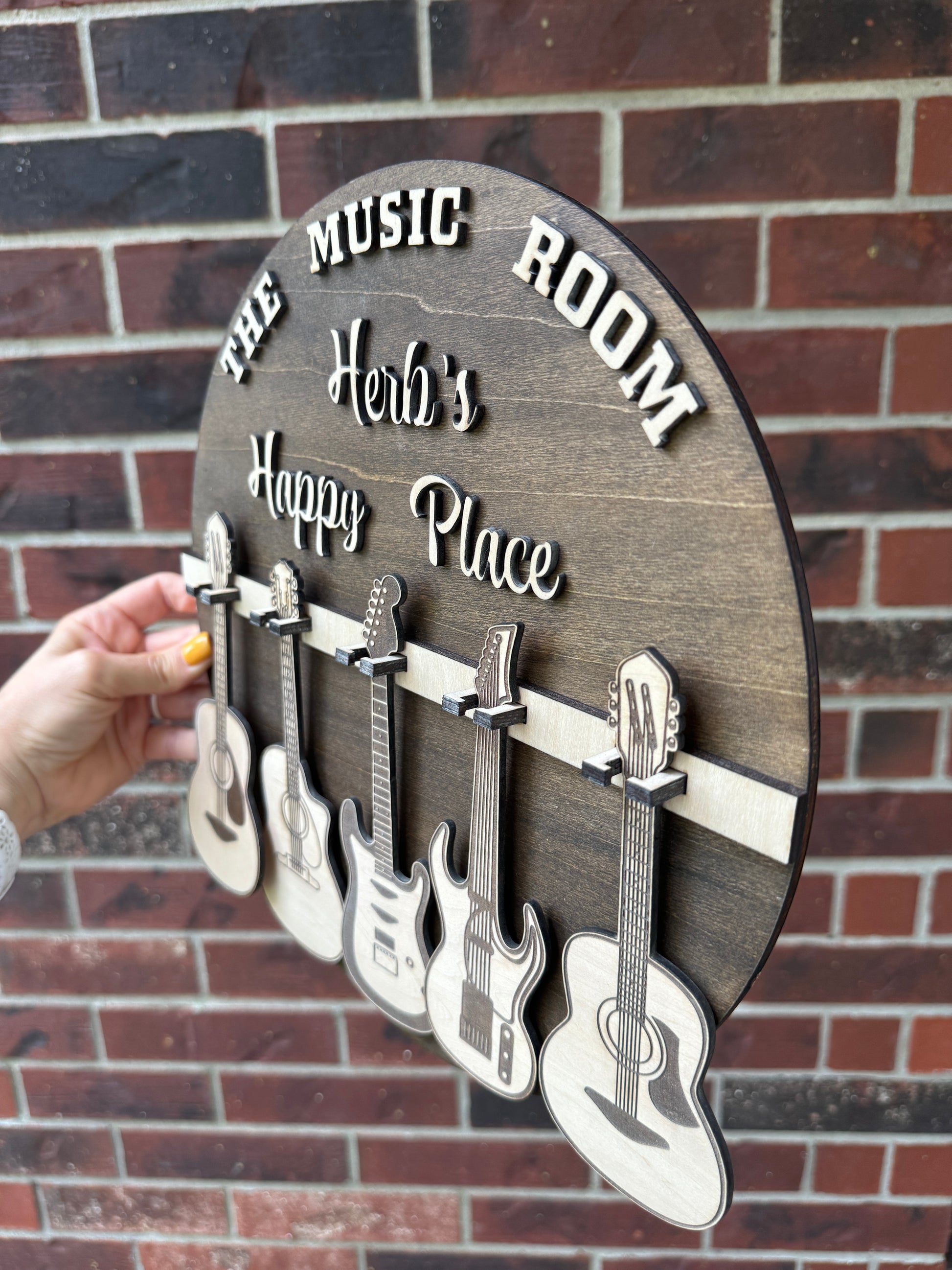 This multilayered wood sign holds 5 guitars that can be taken on and off to give a realistic effect, but the hook design prevents them from falling off easily.