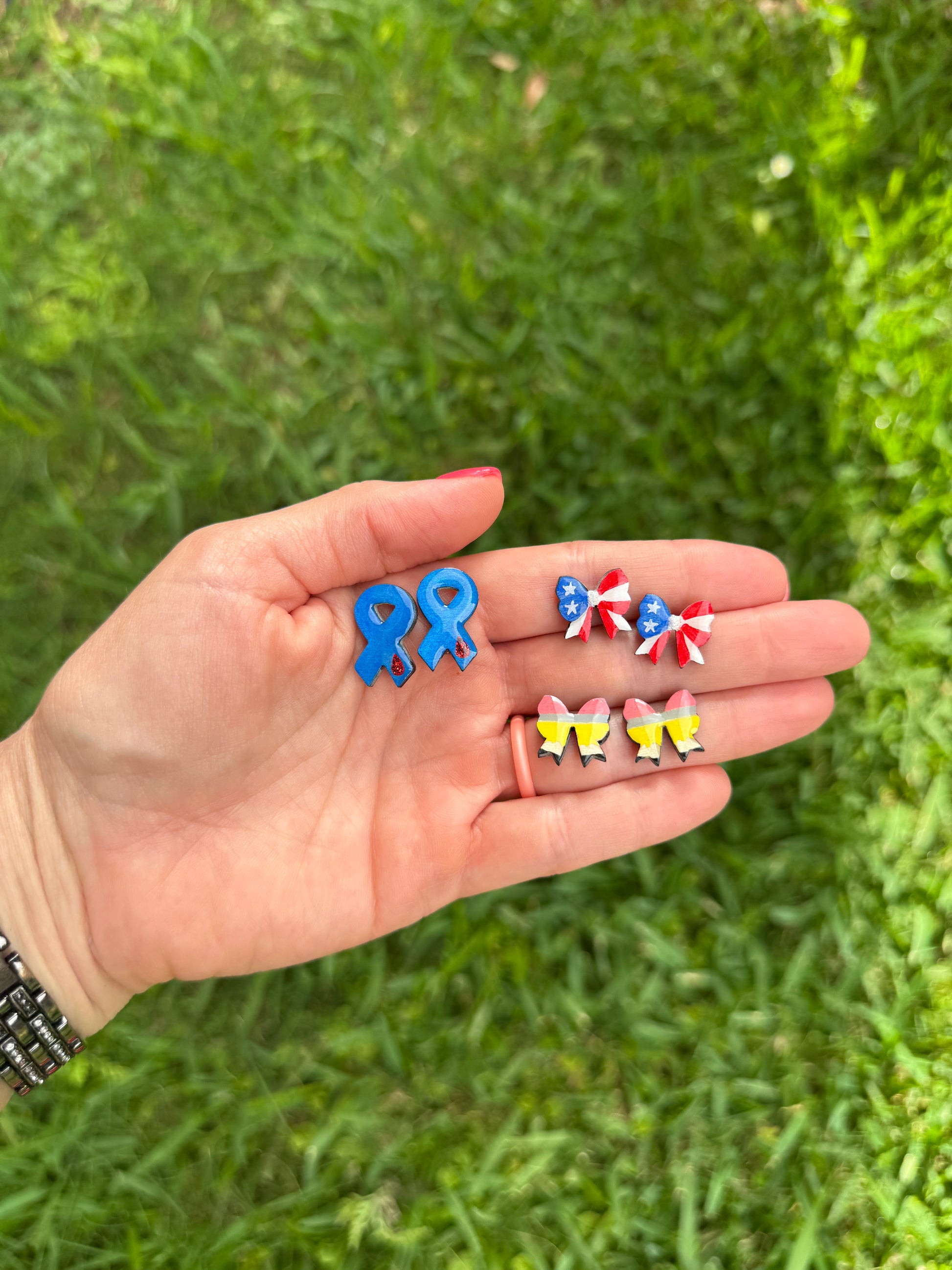 These 0.7 in bows are great accessories for teachers and they make great gifts for teacher appreciation week, Christmas, or end of the year. They are hand painted, epoxy coated, and have hypoallergenic posts on the back.