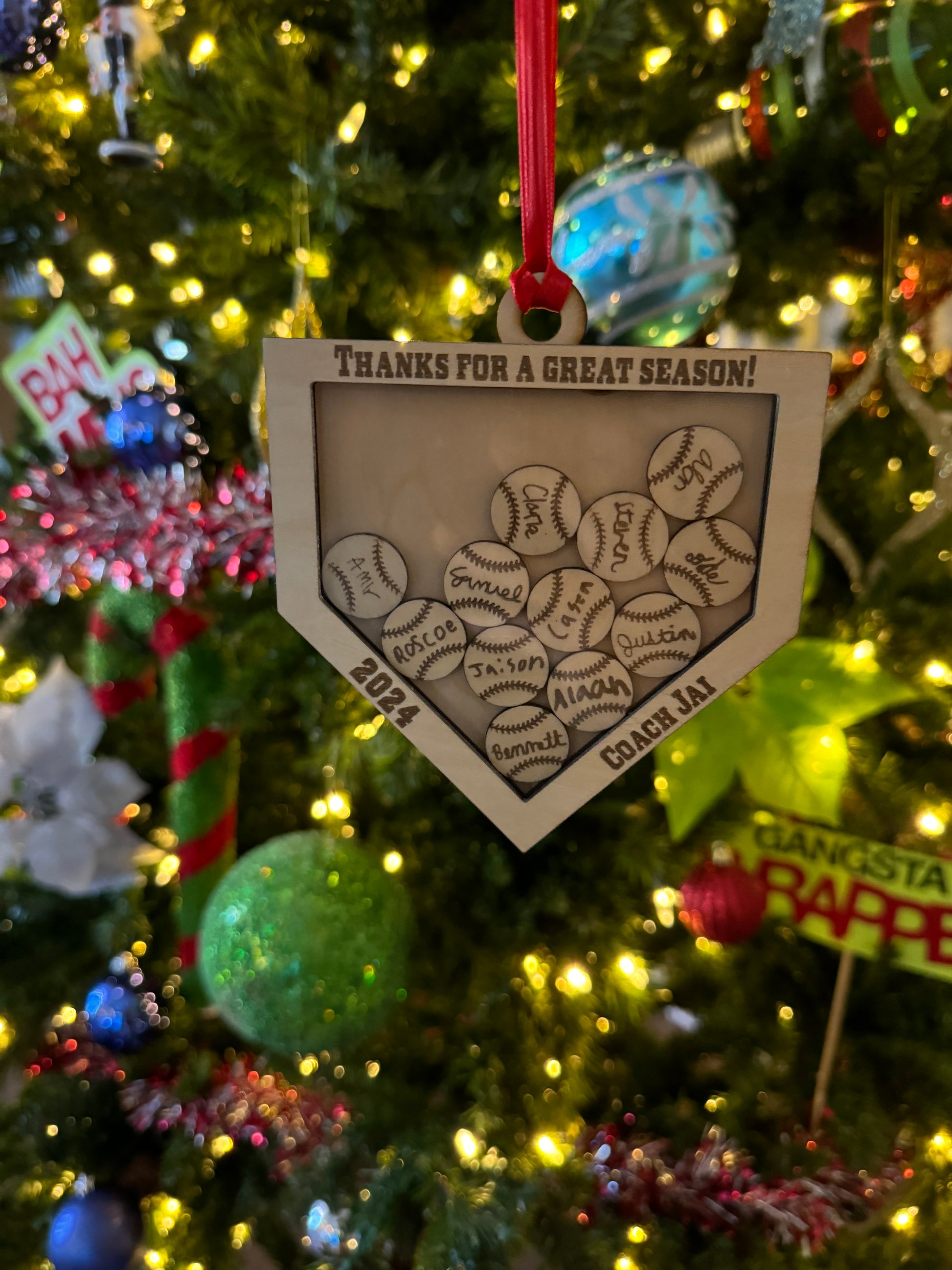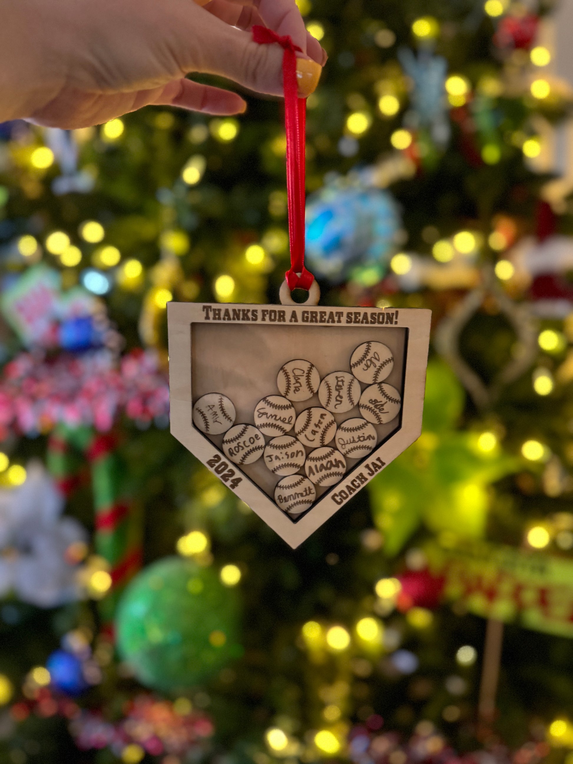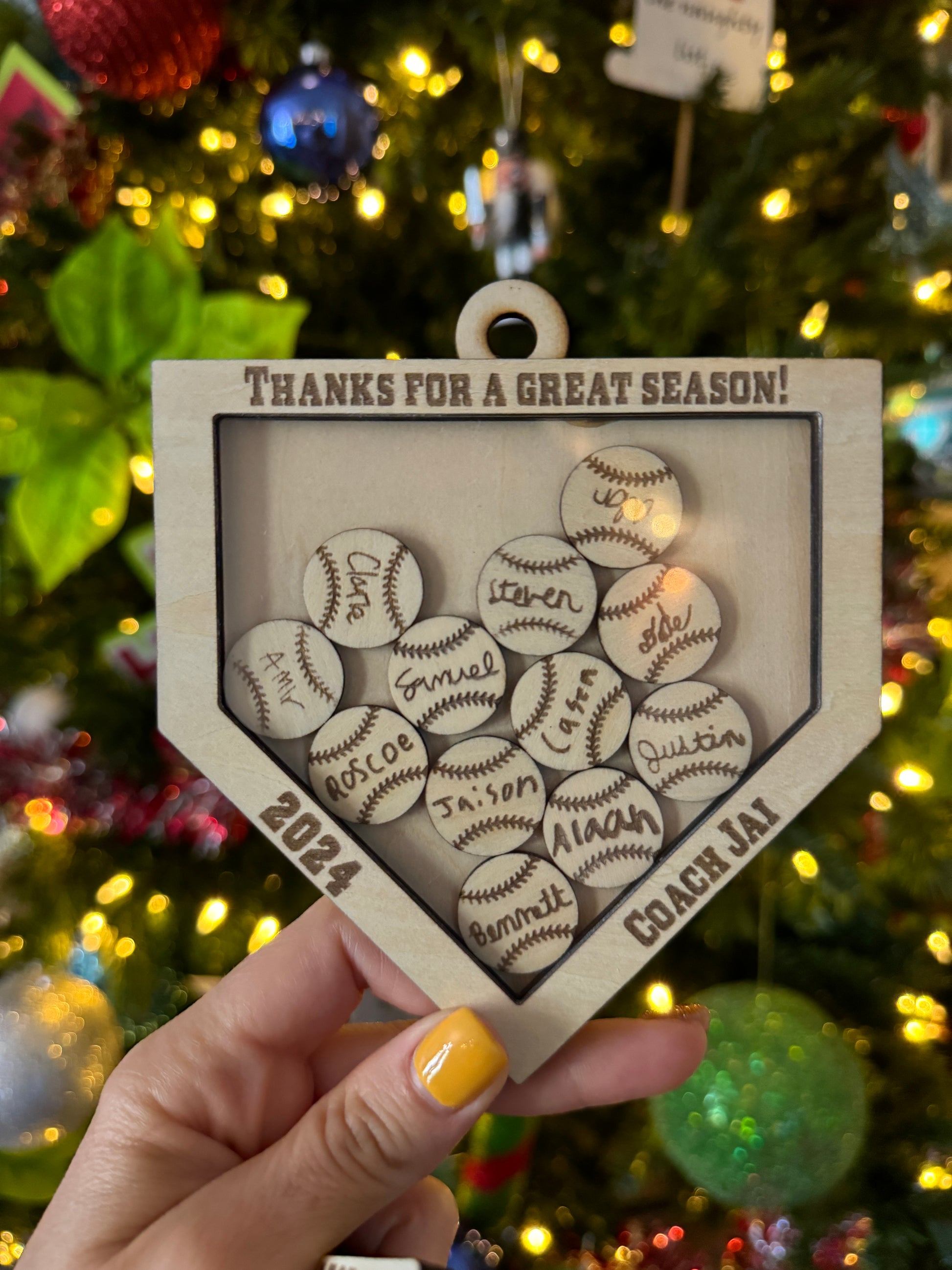 This 5" layered wood ornaments can hold up to 15 baseballs with each player's name on them.