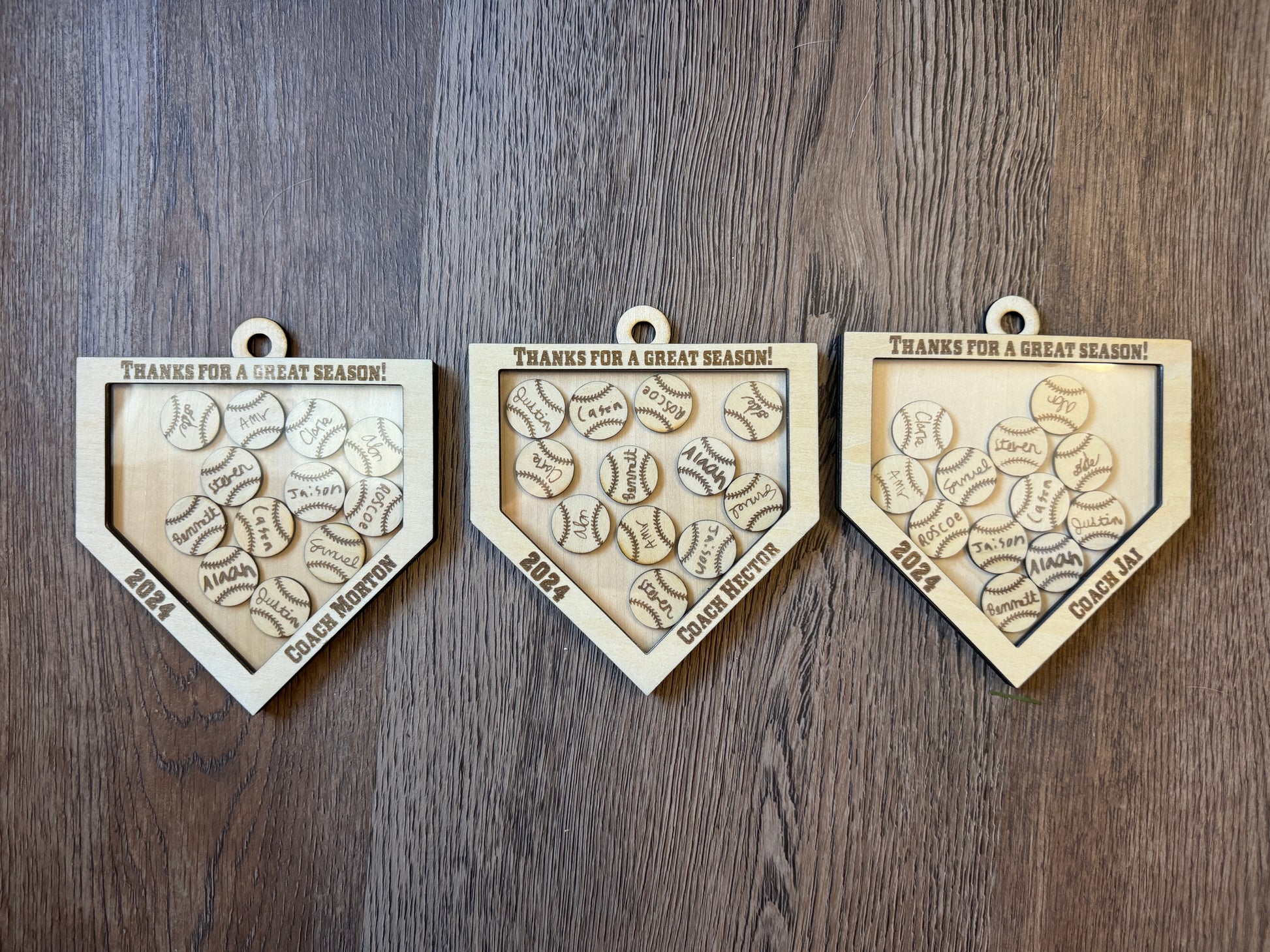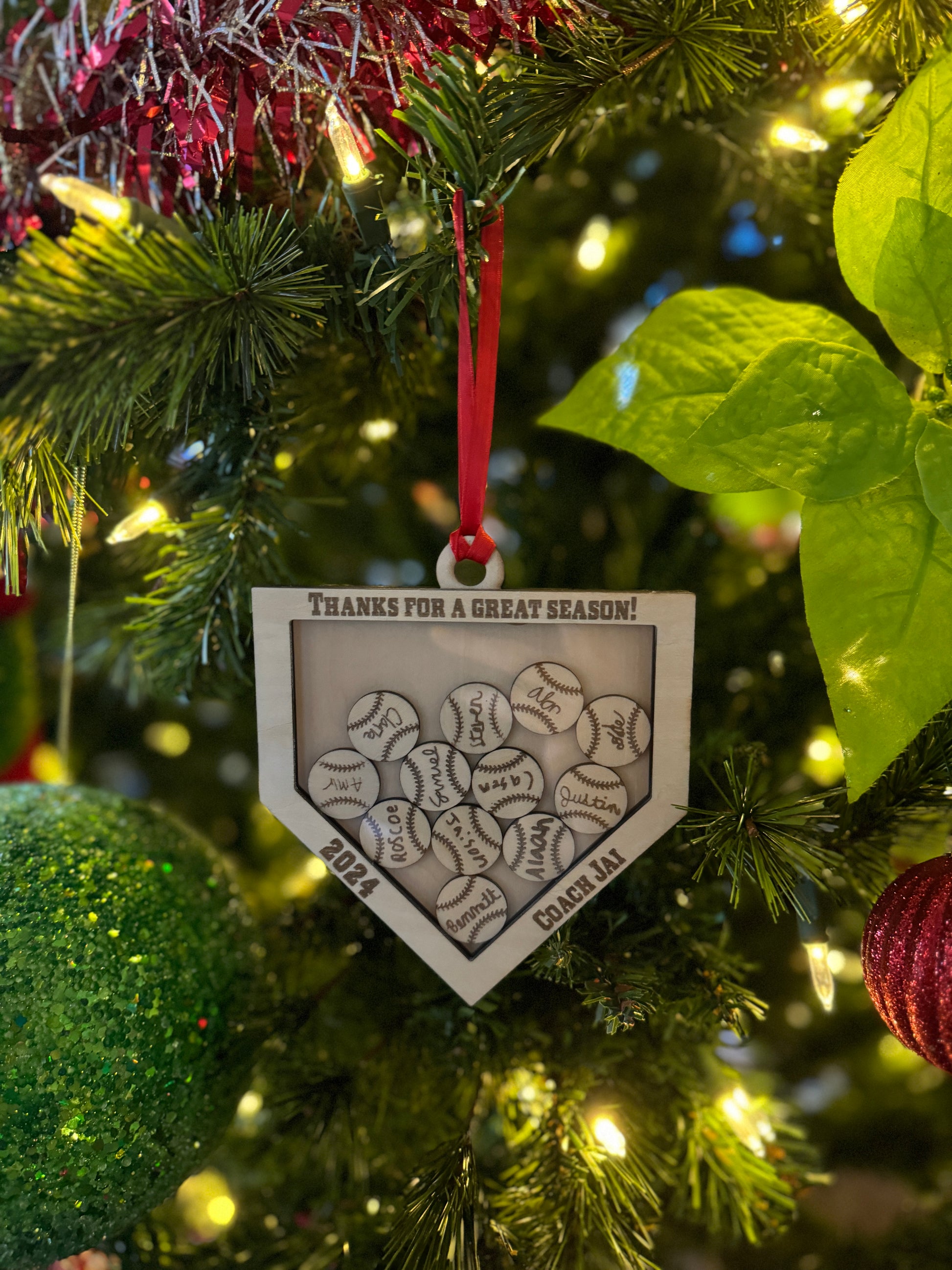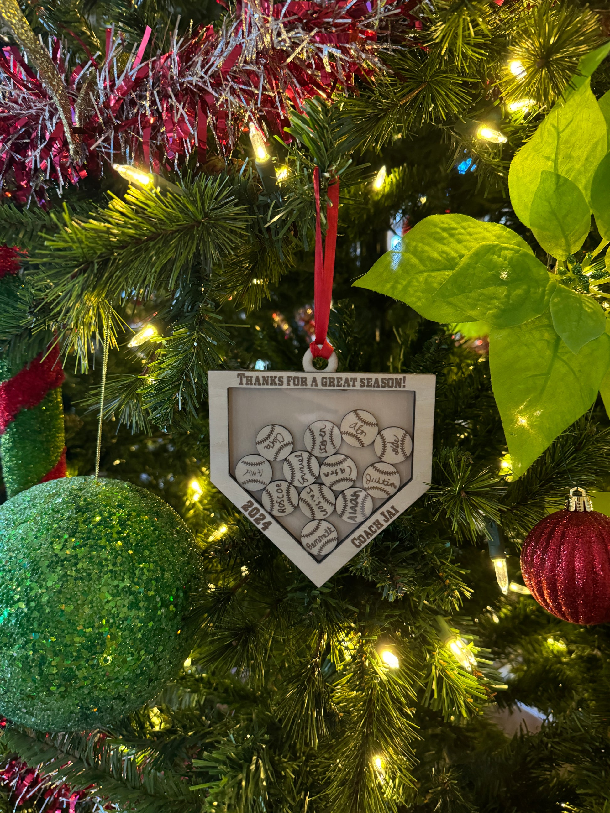 This 5" layered wood ornaments can hold up to 15 baseballs with each player's name on them.