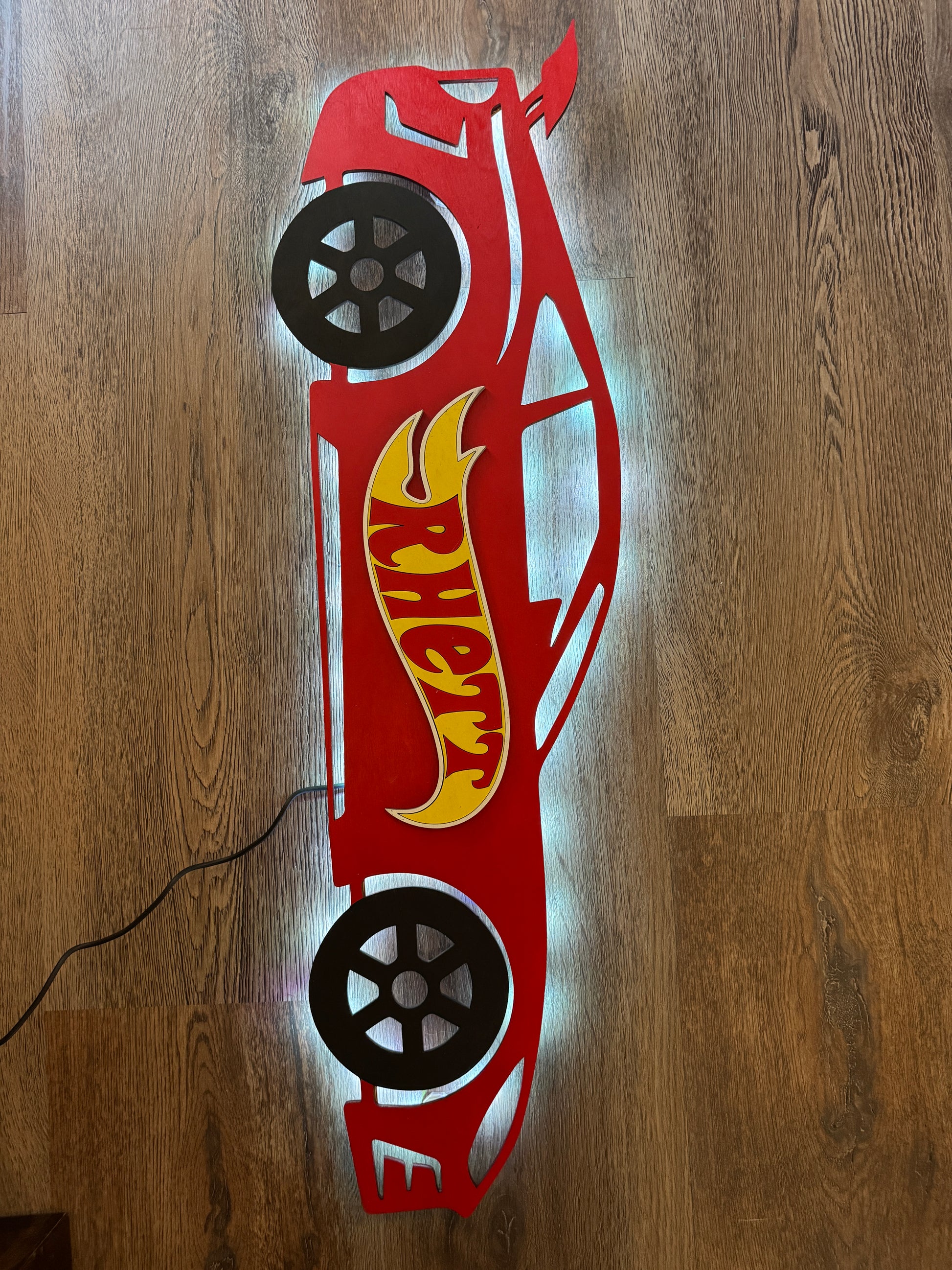 This beautiful LED race car is an awesome addition to any kid that loves cars! The car itself is 30”x13” and made of 1/4” plywood with strip lights on the back. The sign sits about 1” off the wall in order to accommodate the light’s hardware but it also provides a glowing shadow effect this way.
