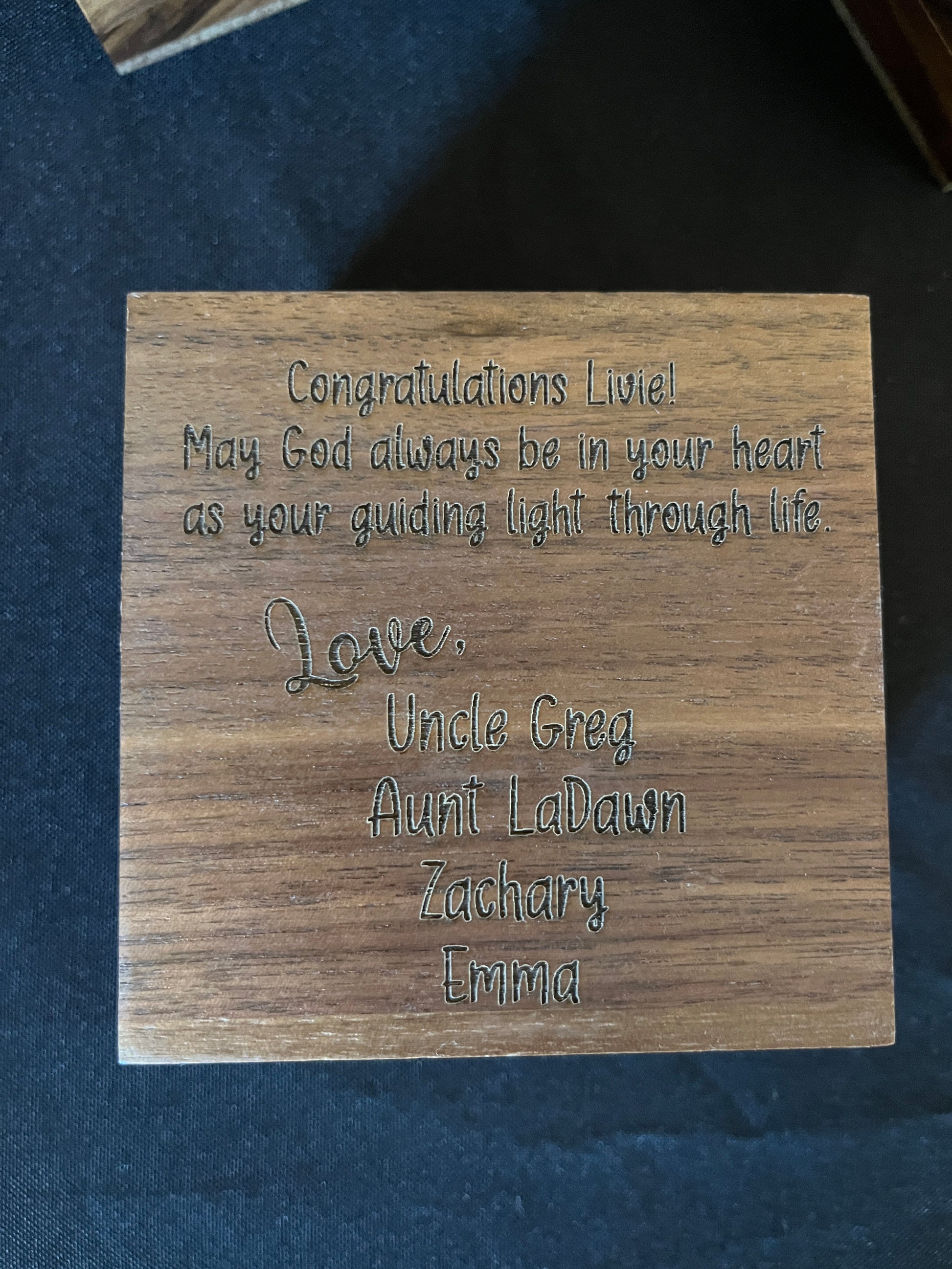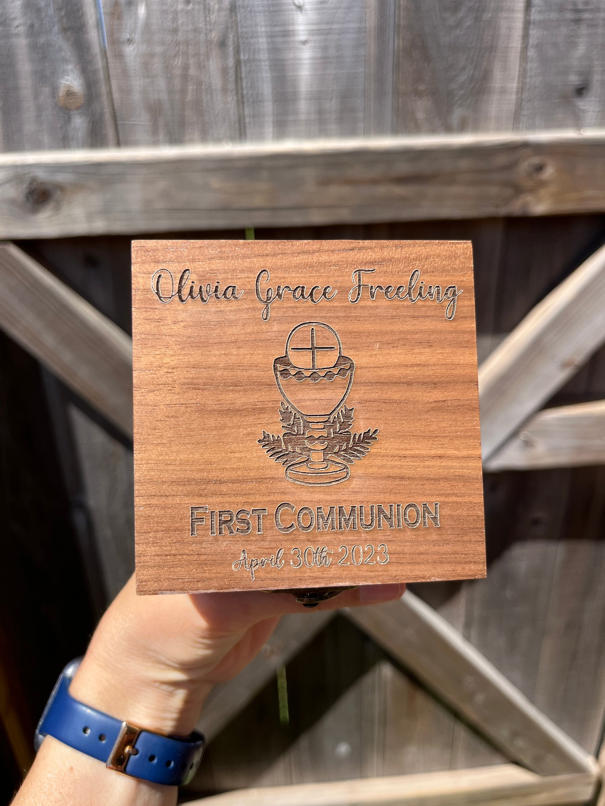3" x 3" x 2" engraved wood box is great for gifting a rosary, storing miscellaneous jewelry, or proposing. Engraving on the top and bottom is included. ROSARY in the picture is NOT INCLUDED (it’s just for display).