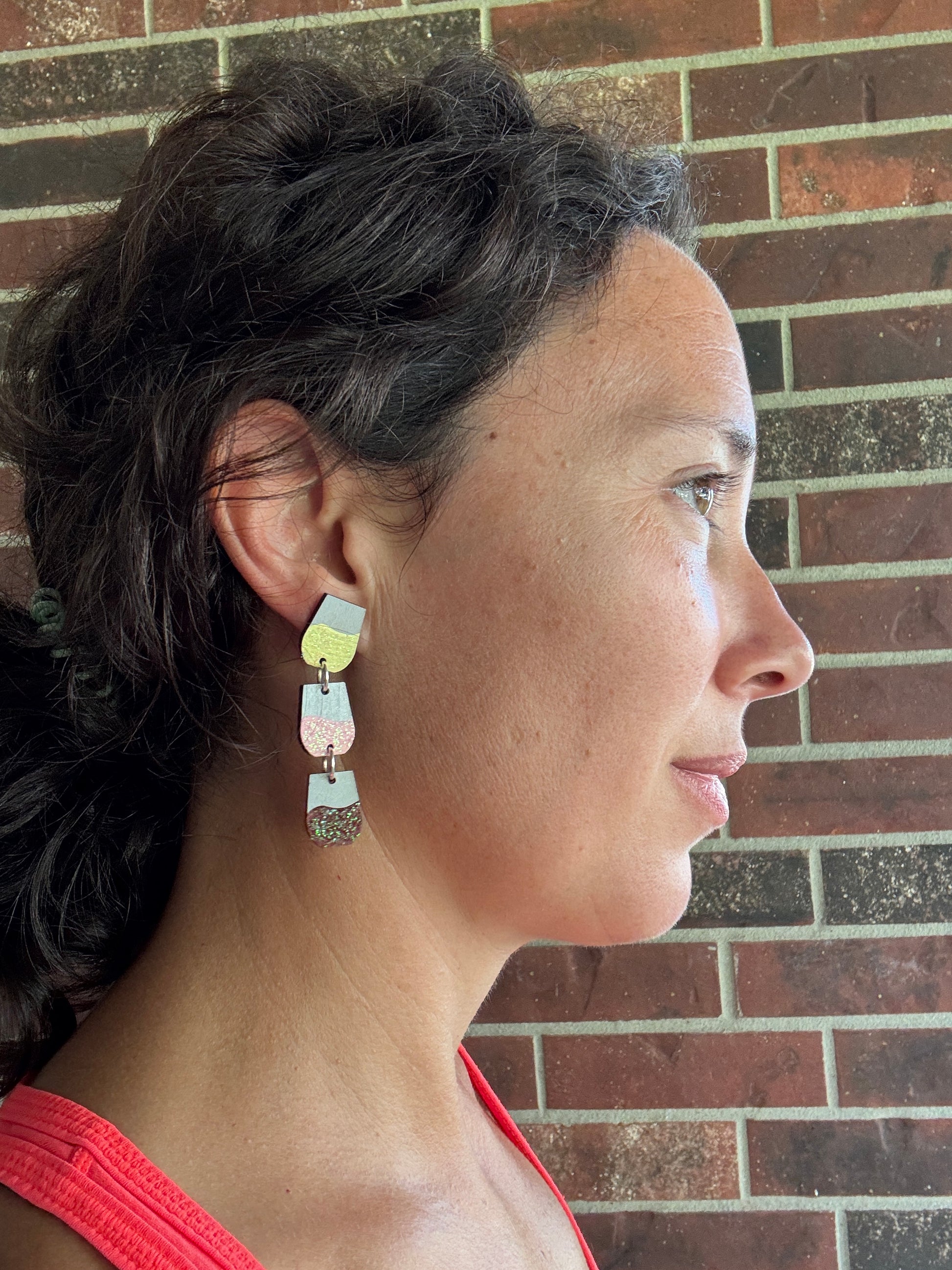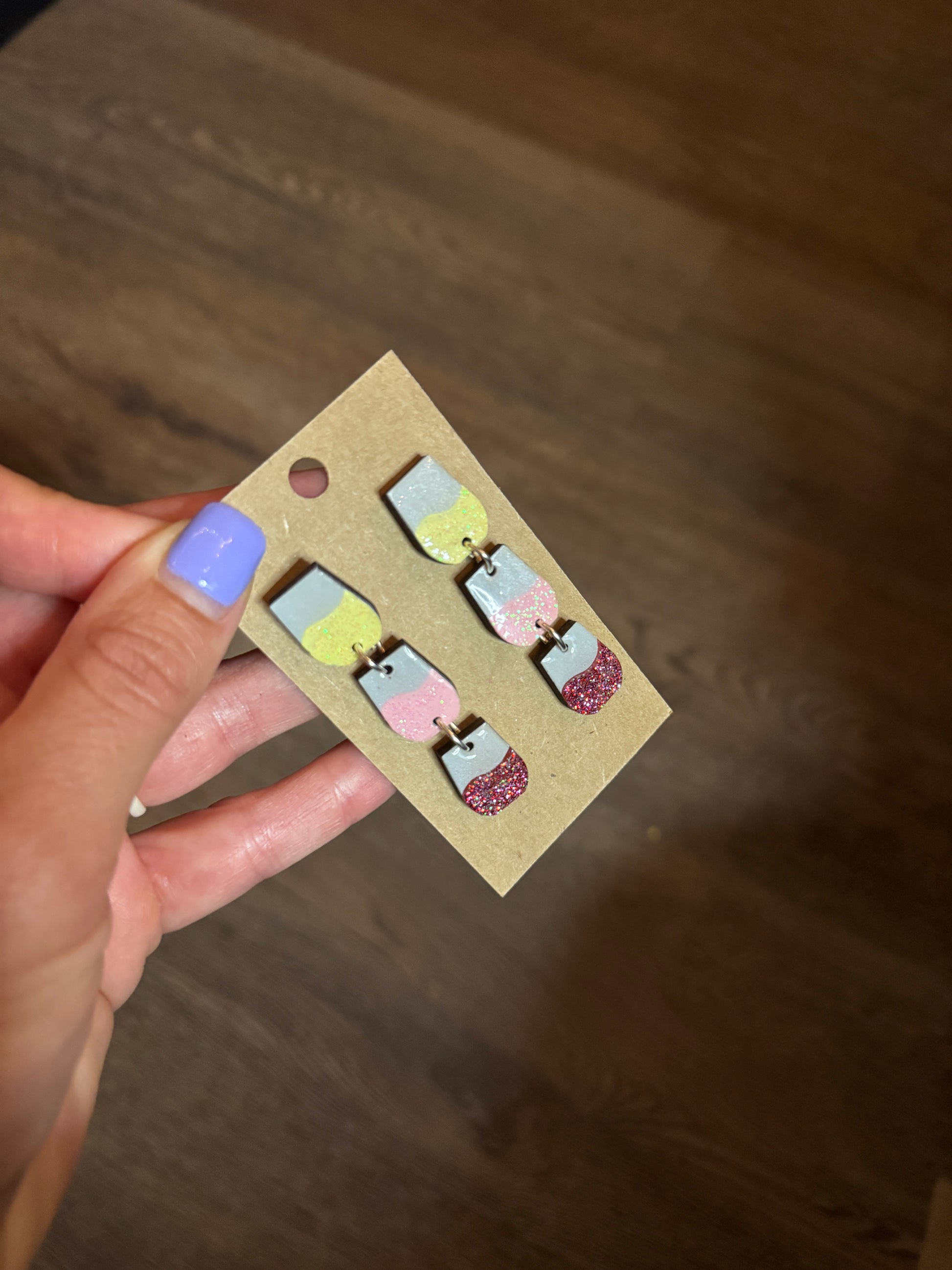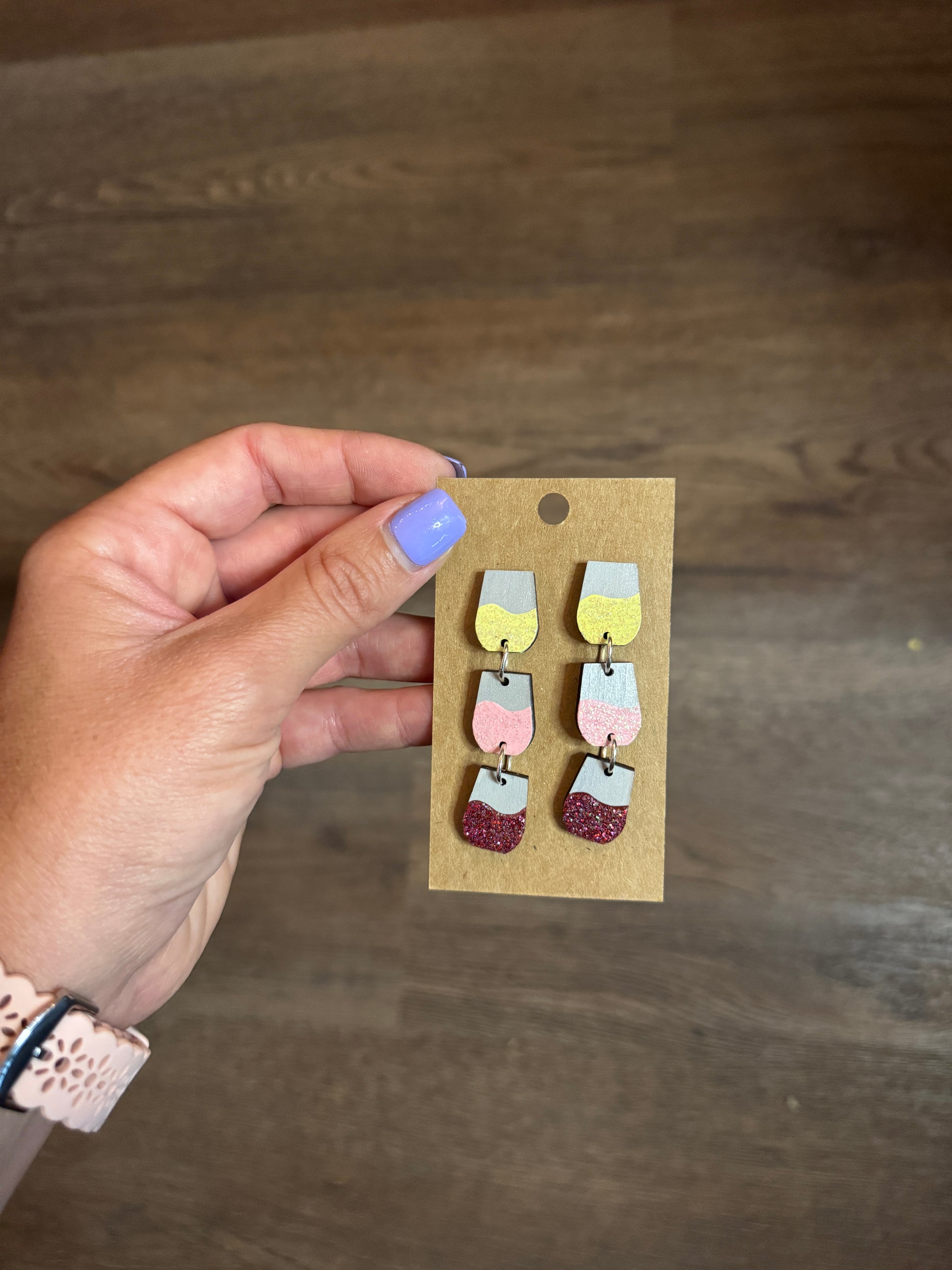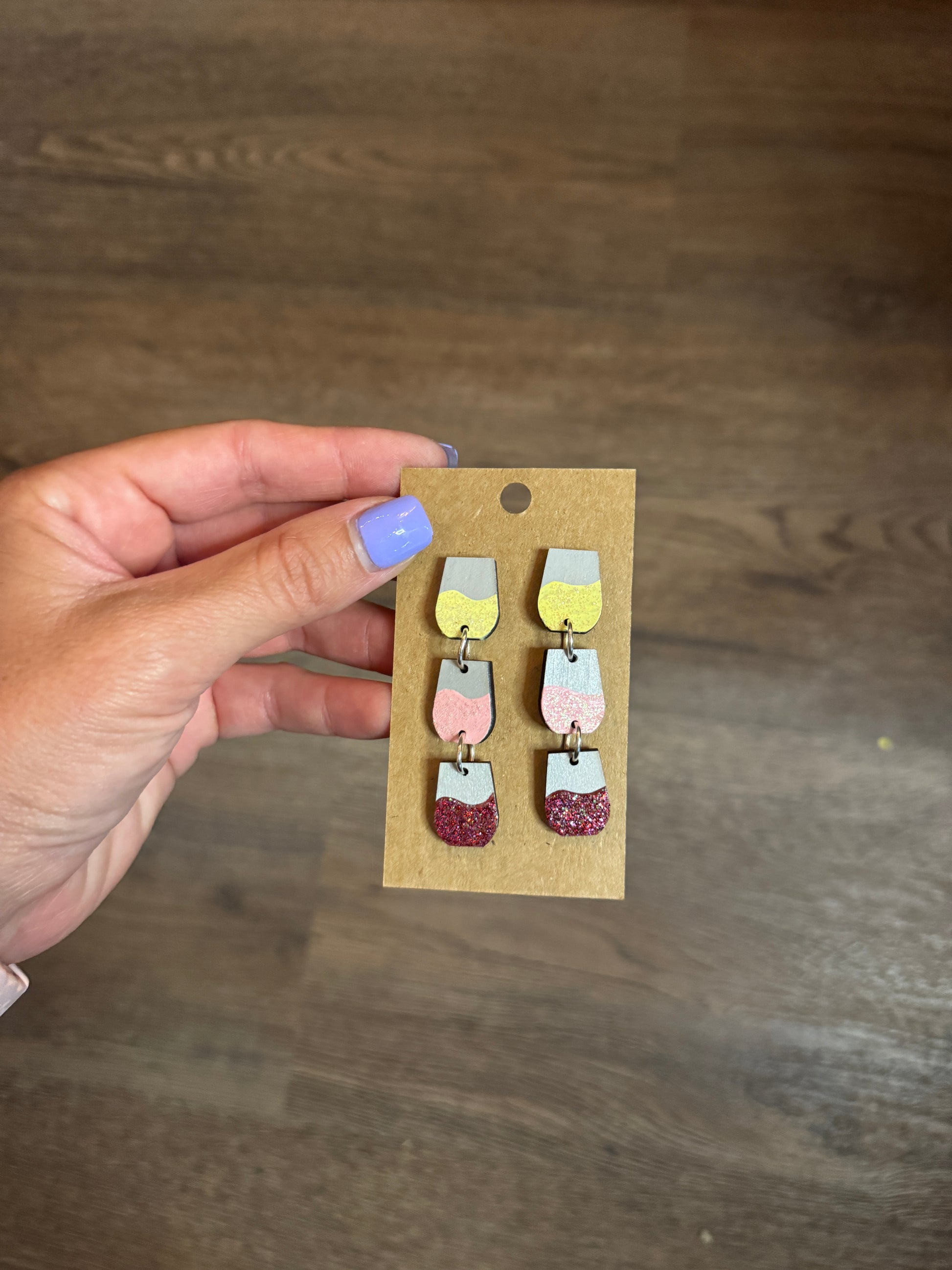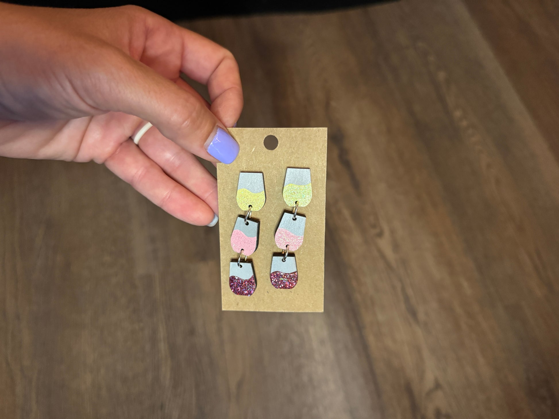 They are made of laser cut wood and topped with resin to give it a glossy protective finish. The post on the back is a hypoallergenic metal.